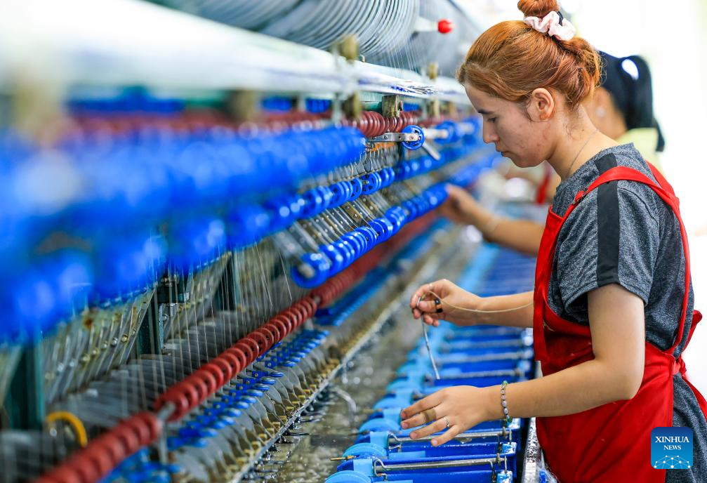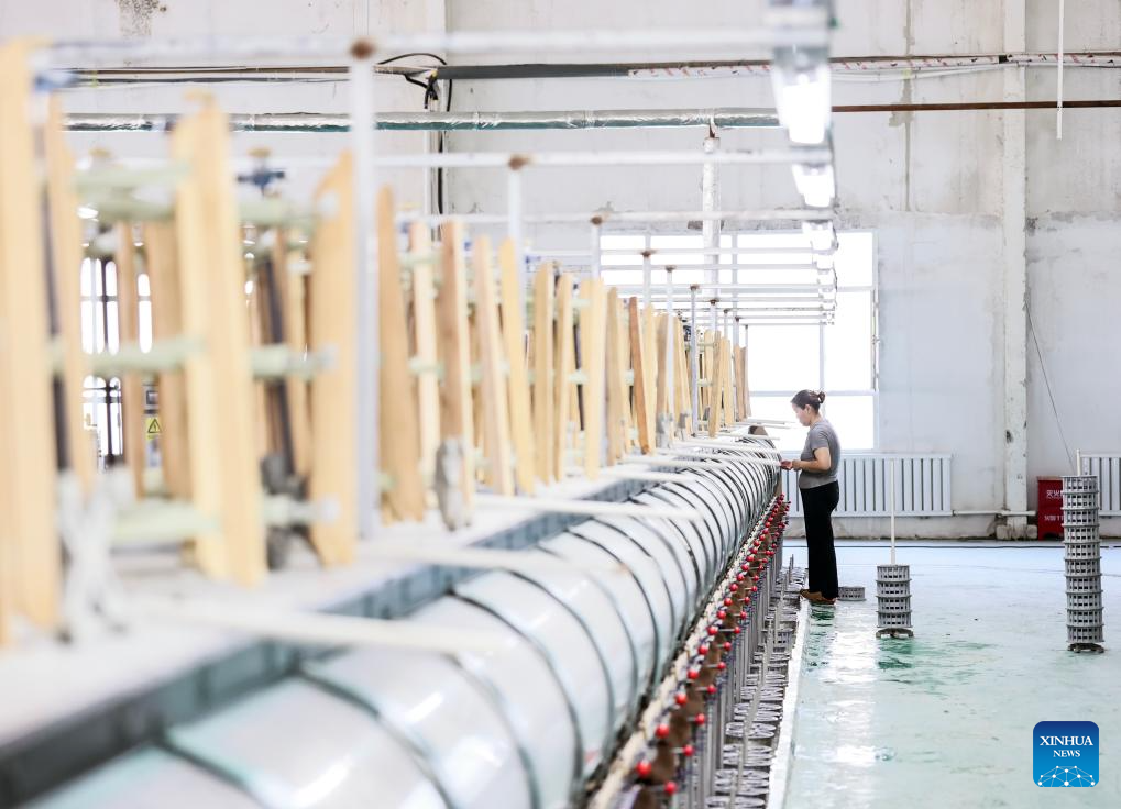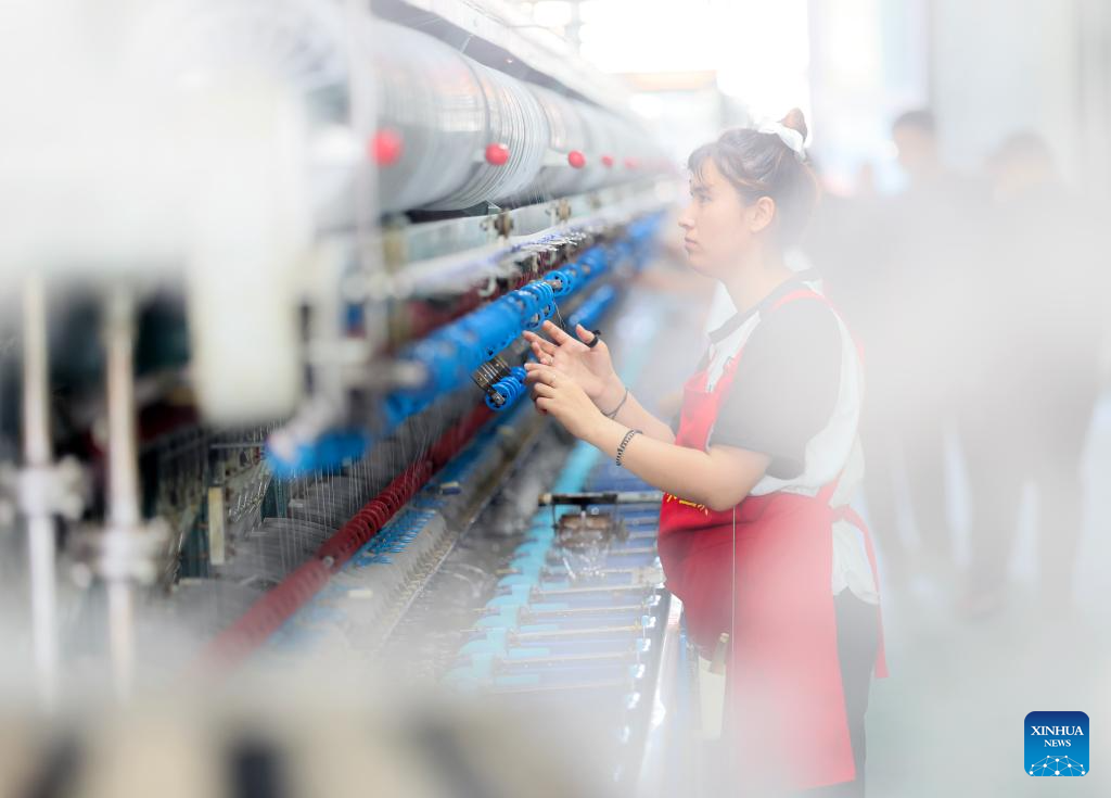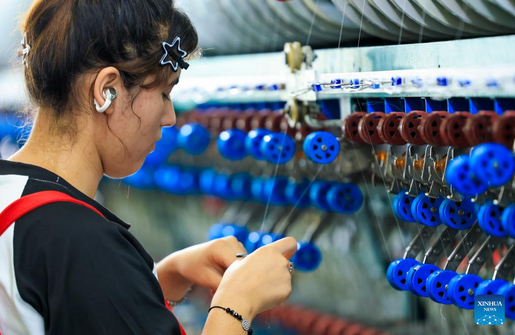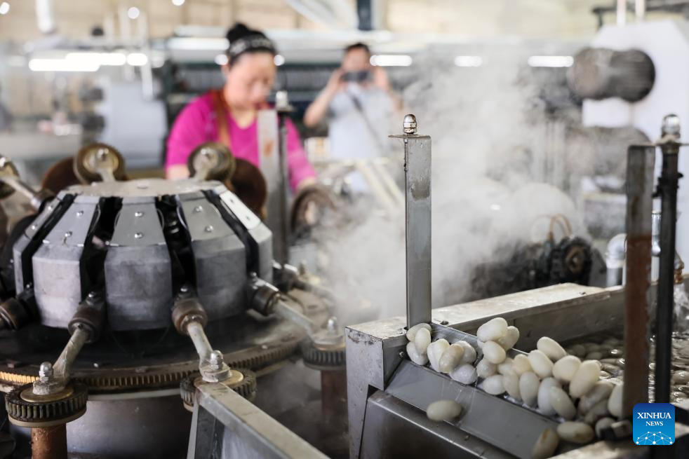 A worker checks silk threads at the production workshop of a silk textile company in Wusu City, northwest China's Xinjiang Uygur Autonomous Region, July 29, 2025. In recent years, Wusu City has introduced an intelligent full-industry-chain project for mulberry silk production, by scaling up silkworm breeding and mulberry growing. This initiative aims to optimize the local agricultural structure, boost farmers' income, and drive rural revitalization. (Photo by Lan Hongguang/Xinhua)