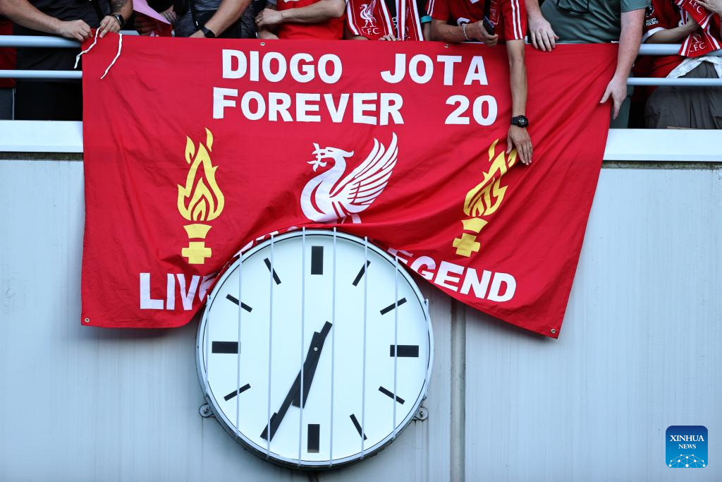 Fans of Liverpool hold up banners in memory of Diogo Jota and Andre Silva before the Meiji Yasuda J. League World Challenge 2025 match between Liverpool and Yokohama F. Marinos, in Yokohama, Japan, July 30, 2025. (Xinhua/Jia Haocheng)