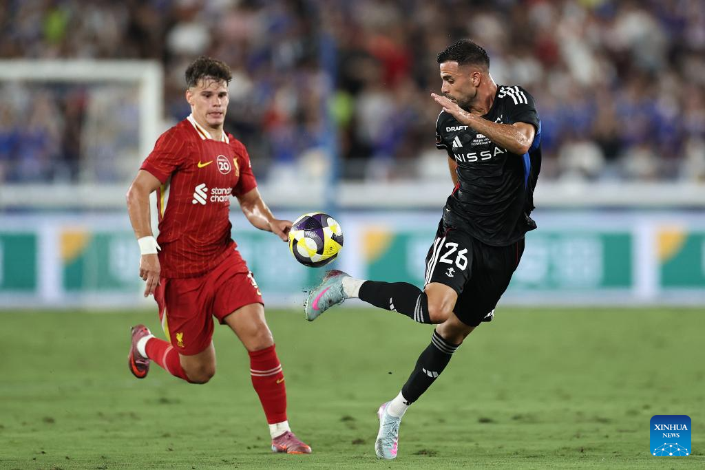 Dean David (R) of Yokohama F. Marinos vies for the ball during the Meiji Yasuda J. League World Challenge 2025 match between Liverpool and Yokohama F. Marinos, in Yokohama, Japan, July 30, 2025. (Xinhua/Jia Haocheng)