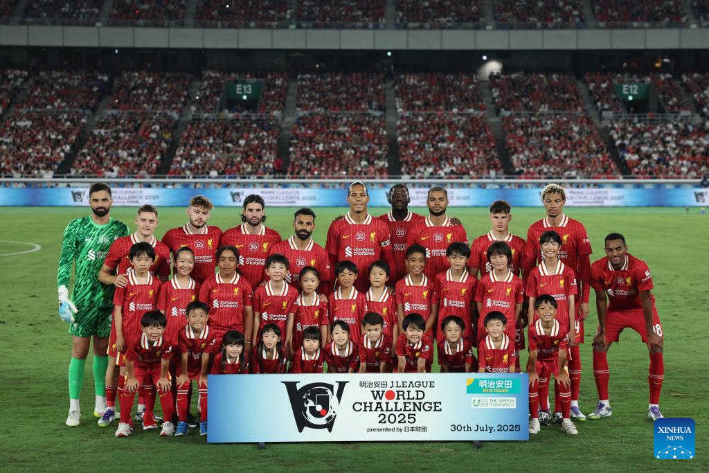 Starting players of Liverpool line up before the Meiji Yasuda J. League World Challenge 2025 match between Liverpool and Yokohama F. Marinos, in Yokohama, Japan, July 30, 2025. (Xinhua/Jia Haocheng)