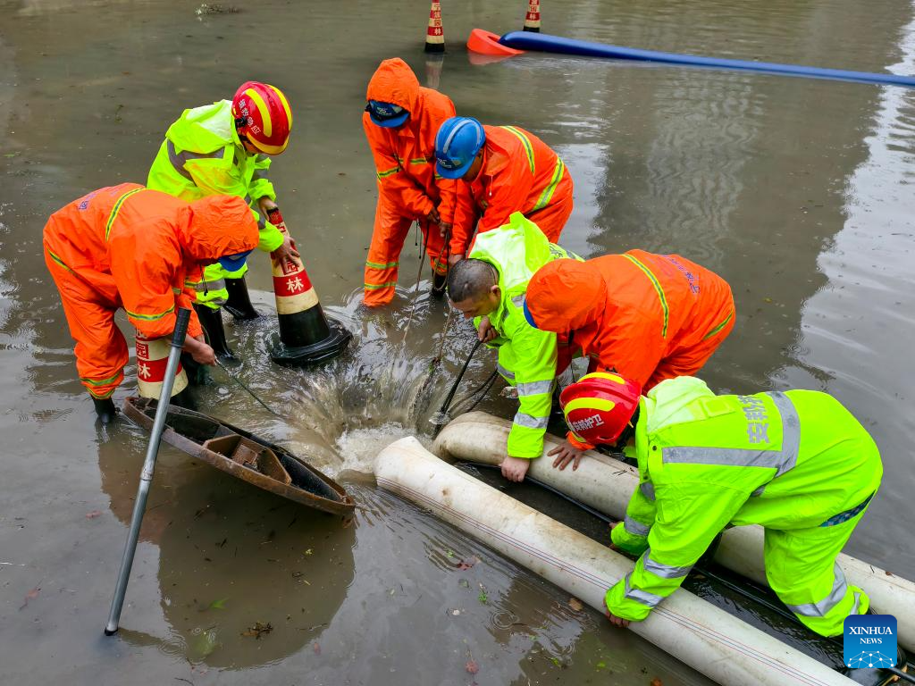 Rescuers work to drain water from a flooded road in Ningbo, east China's Zhejiang Province, July 30, 2025. Co-May, the eighth typhoon of this year, made landfall for the second time in east China's Shanghai Municipality on Wednesday afternoon after it made landfall in Zhejiang Province in early Wednesday morning, according to the Shanghai central meteorological observatory.