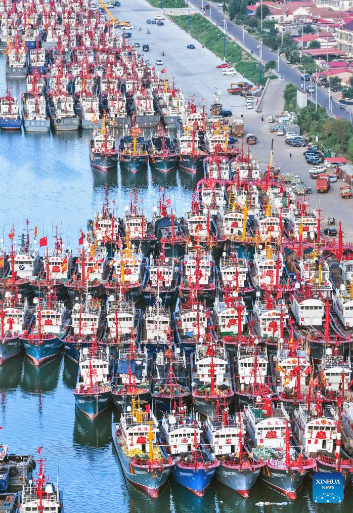 An aerial drone photo taken on July 30, 2025 shows fishing boats moored at a fishing port in Ganyu District, Lianyungang Port, east China's Jiangsu Province. Co-May, the eighth typhoon of this year, made landfall for the second time in east China's Shanghai Municipality on Wednesday afternoon after it made landfall in Zhejiang Province in early Wednesday morning, according to the Shanghai central meteorological observatory.