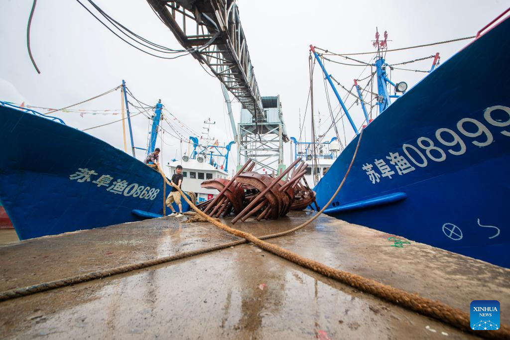 The crew member inspect and reinforce mooring ropes at Huangshagang port in Sheyang County of Yancheng, east China's Jiangsu Province, July 30, 2025. Co-May, the eighth typhoon of this year, made landfall for the second time in east China's Shanghai Municipality on Wednesday afternoon after it made landfall in Zhejiang Province in early Wednesday morning, according to the Shanghai central meteorological observatory.