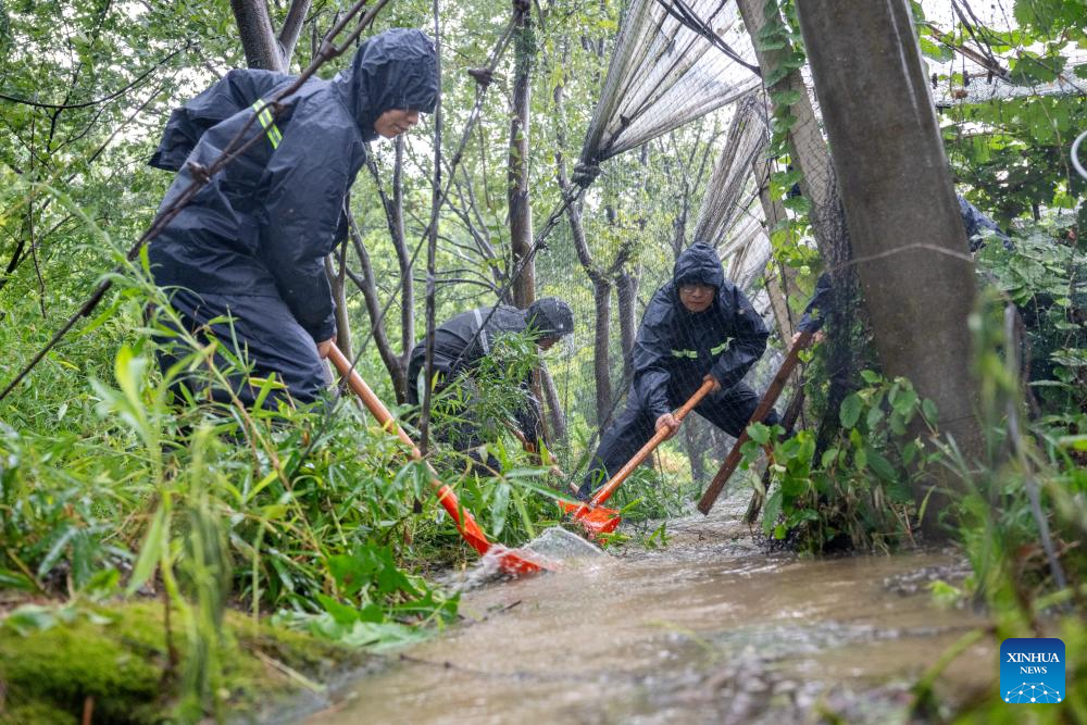 Volunteers and militiamen help farmers drain a ditch at a grape planting base in Changping Village of Changxing County, Huzhou City, east China's Zhejiang Province, July 30, 2025. Co-May, the eighth typhoon of this year, made landfall for the second time in east China's Shanghai Municipality on Wednesday afternoon after it made landfall in Zhejiang Province in early Wednesday morning, according to the Shanghai central meteorological observatory.