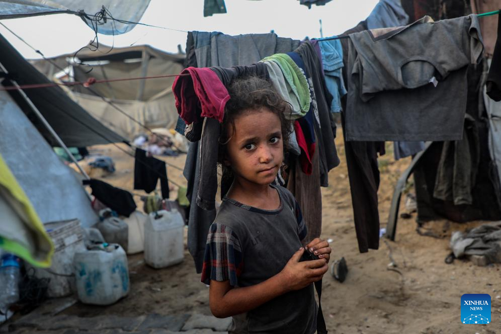 A kid of Mohammed Abu Amsha, a 39-year-old father of five, is pictured near her tent in Gaza City, July 29, 2025. The family relies on small amounts of pasta, which they obtained from humanitarian aid to the Gaza Strip, and lacks basic cooking ingredients such as tomatoes, vegetables, or even food flavorings. (Photo by Rizek Abdeljawad/Xinhua)