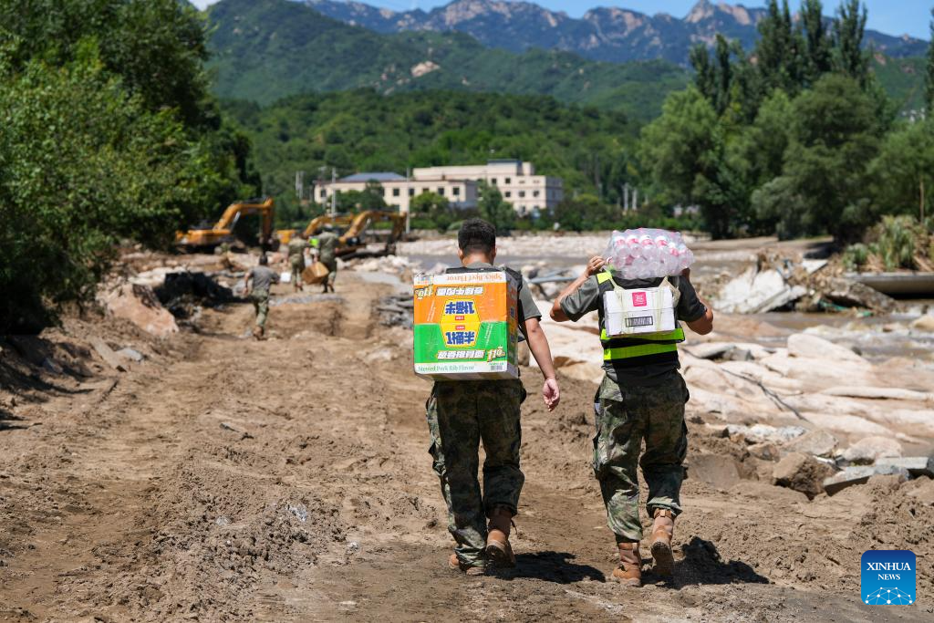 Rescuers deliver relief supplies on foot to road-blocked villages in Fengjiayu Town, Miyun District of Beijing, capital of China, July 30, 2025. Due to continuous heavy rainfall in recent days, hundreds of villages in multiple districts of Beijing have been affected. In some villages of Fengjiayu Town, Miyun District, the roads have not yet been restored. Relevant departments have organized multiple rescue forces including firefighters and militiamen to transport relief supplies on foot to the villages to ensure the living needs of the affected villagers. (Xinhua/Ju Huanzong)