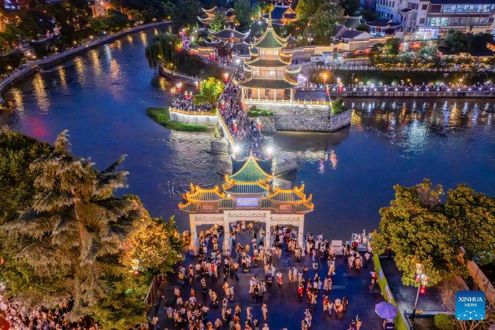 An aerial drone photo taken on July 30, 2025 shows people visiting Jiaxiu tower scenic area in Guiyang, capital of southwest China's Guizhou Province. Guizhou Province, with its cool climate and rich tourism resources, attracts tourists from all over the country during the peak summer travel season. (Xinhua/Liu Xu)