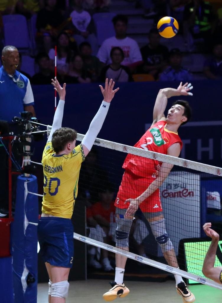 Brazil took control in the third set with a 25-16 win, then sealed the match in the fourth, pulling away late to secure a 25-21 victory. Brazil's Alan Souza scored a match-high 26 points, while Wen Zihua led China with 15.