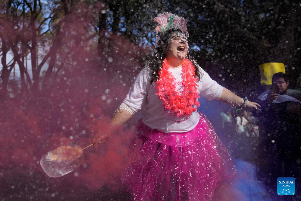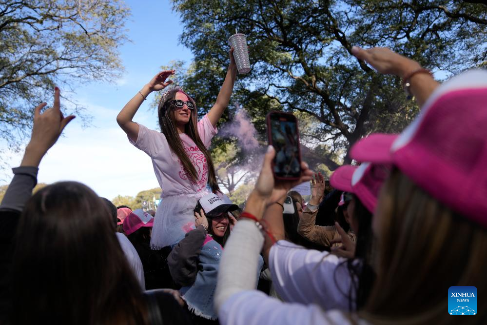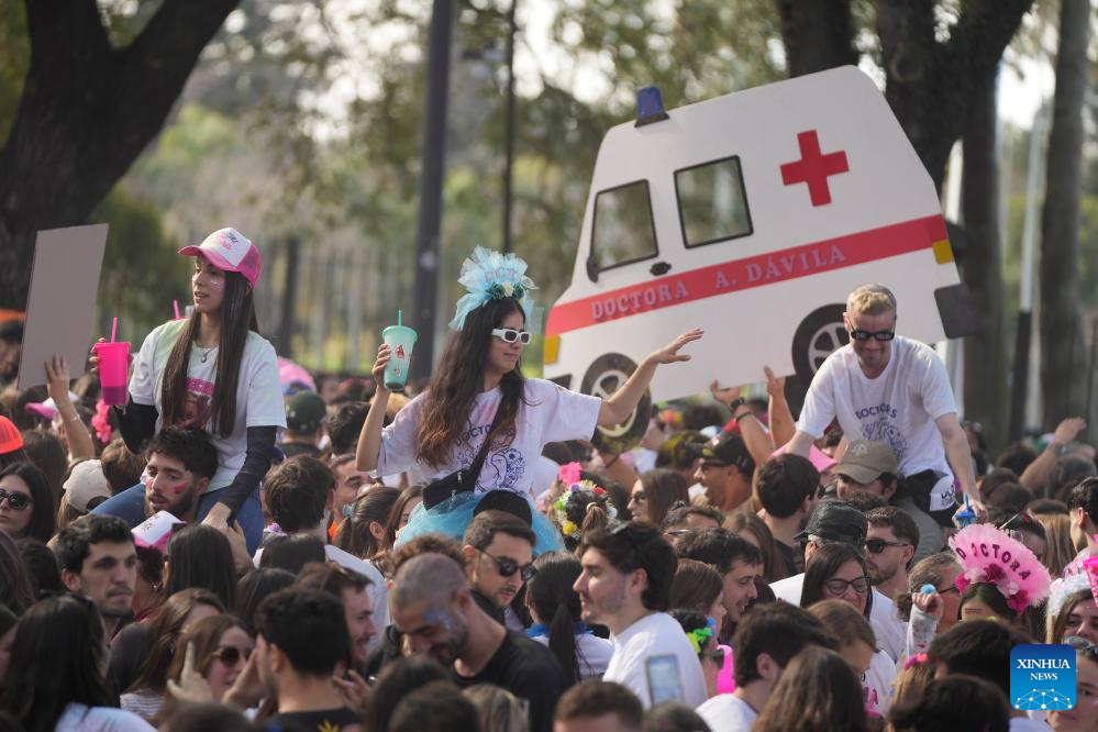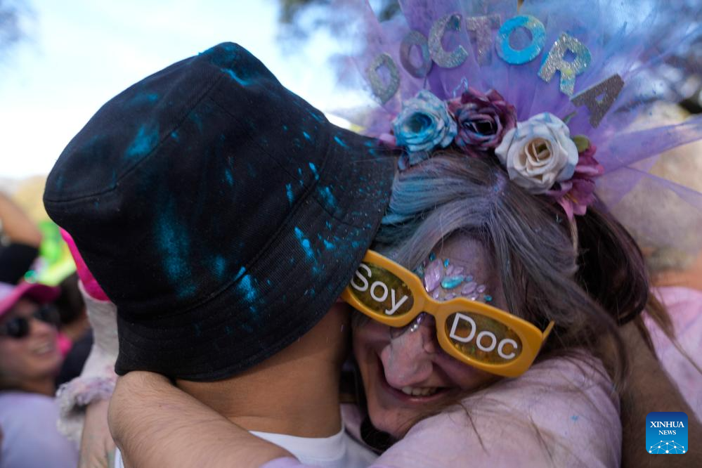 Students from the University of the Republic Faculty of Medicine celebrate their graduation in Batlle Park in Montevideo, Uruguay, on July 31, 2025. (Photo by Nicolas Celaya/Xinhua)