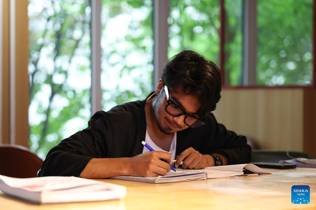 Muhammad Mohsin studies at his apartment building in north China's Tianjin, July 21, 2025.
