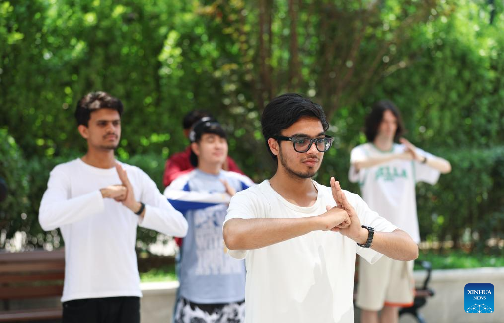 Muhammad Mohsin (front) practices Baduanjin, a traditional Chinese fitness routine, at Tianjin International Chinese College in north China's Tianjin, July 22, 2025.