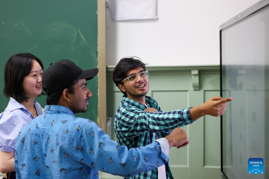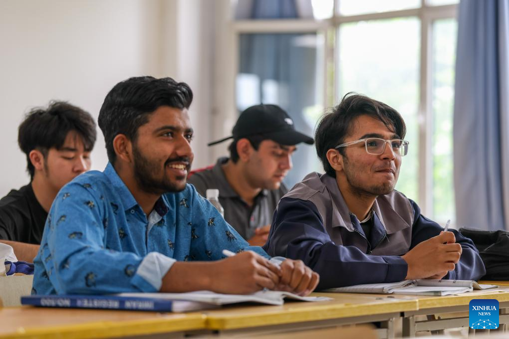 Muhammad Mohsin (R) communicates with classmates during a lecture at Tianjin International Chinese College in north China's Tianjin, July 17, 2025.