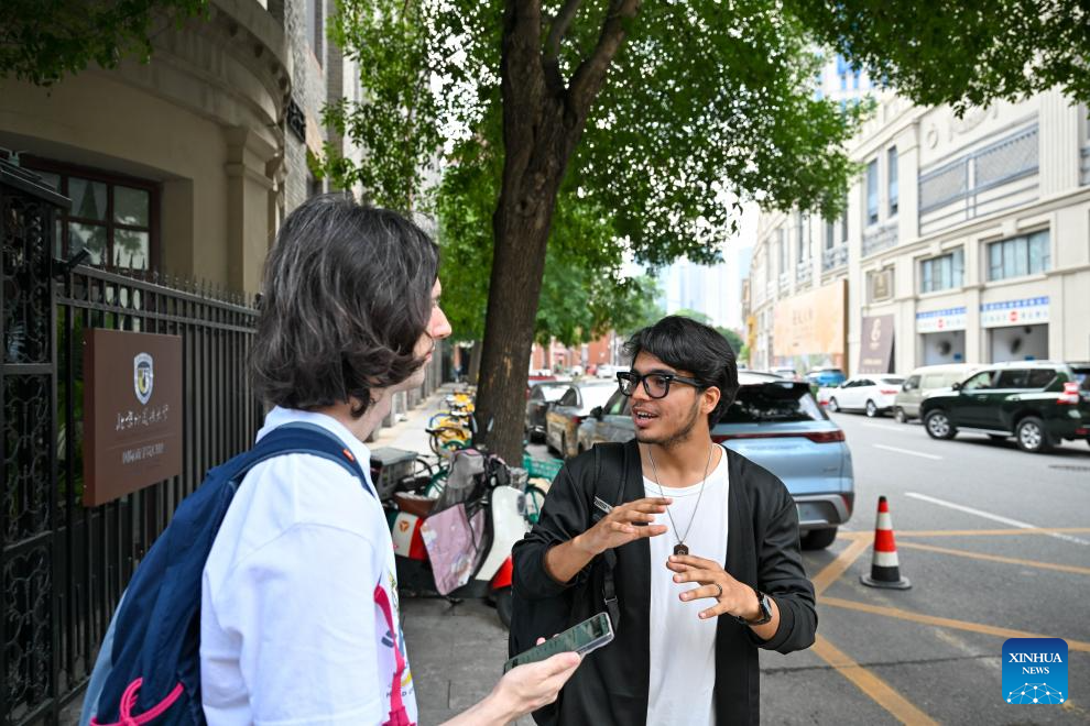 Muhammad Mohsin (R) communicates with a classmate after a lecture at Tianjin International Chinese College in north China's Tianjin, July 21, 2025.