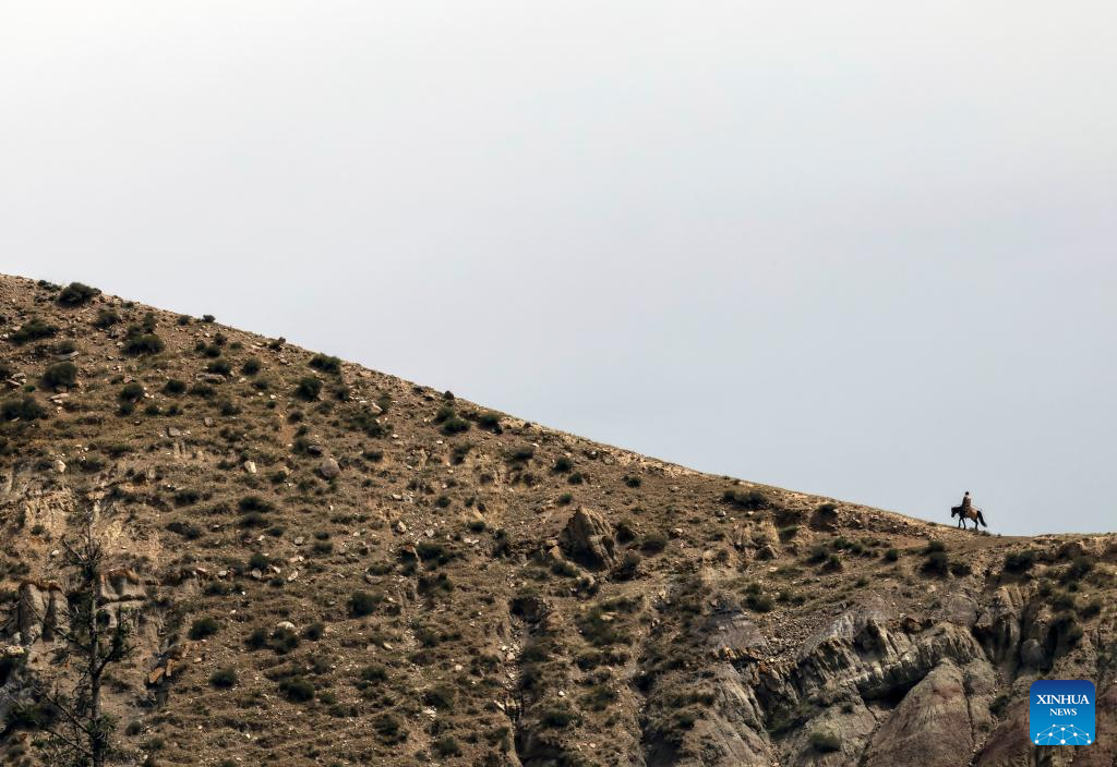 Horses are pictured at a scenic spot in Wusu City, northwest China's Xinjiang Uygur Autonomous Region, July 29, 2025. In recent days, multiple areas in Xinjiang have experienced sustained high temperatures, prompting residents and tourists to seek relief in cooler scenic spots.