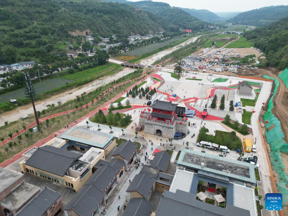 An aerial drone photo taken on Aug. 1, 2025 shows a cultural park themed on the Long March in Nanliang Town, Huachi County of northwest China's Gansu Province. With modern technology and interactive design, the park depicts a vivid history of the Long March, a military maneuver carried out by the Chinese Workers' and Peasants' Red Army from 1934 to 1936. (Xinhua/Zhang Zhimin)