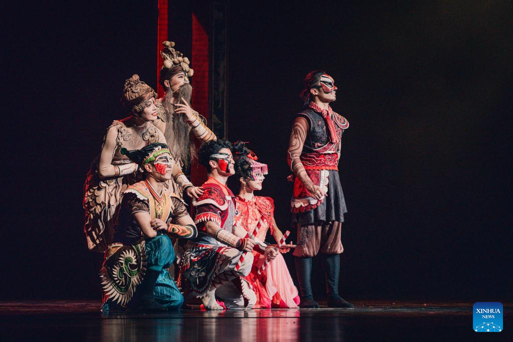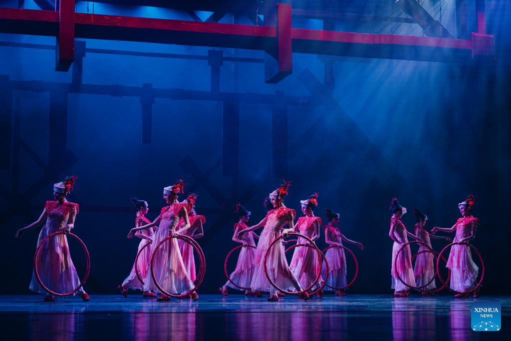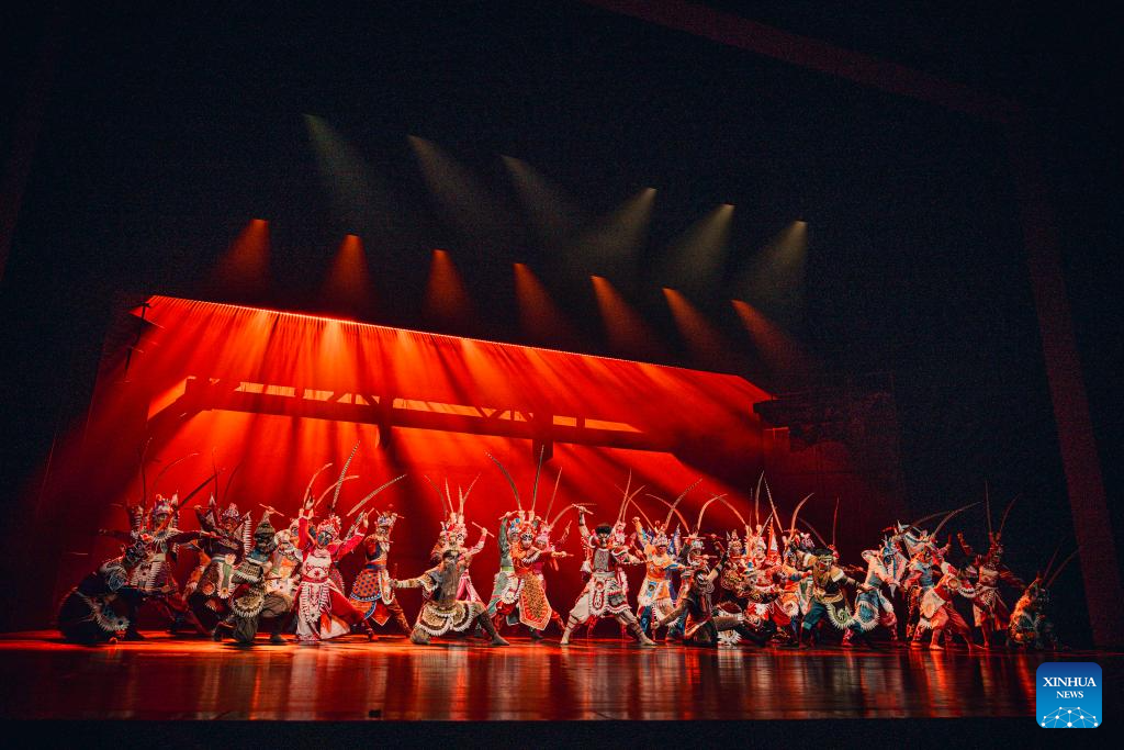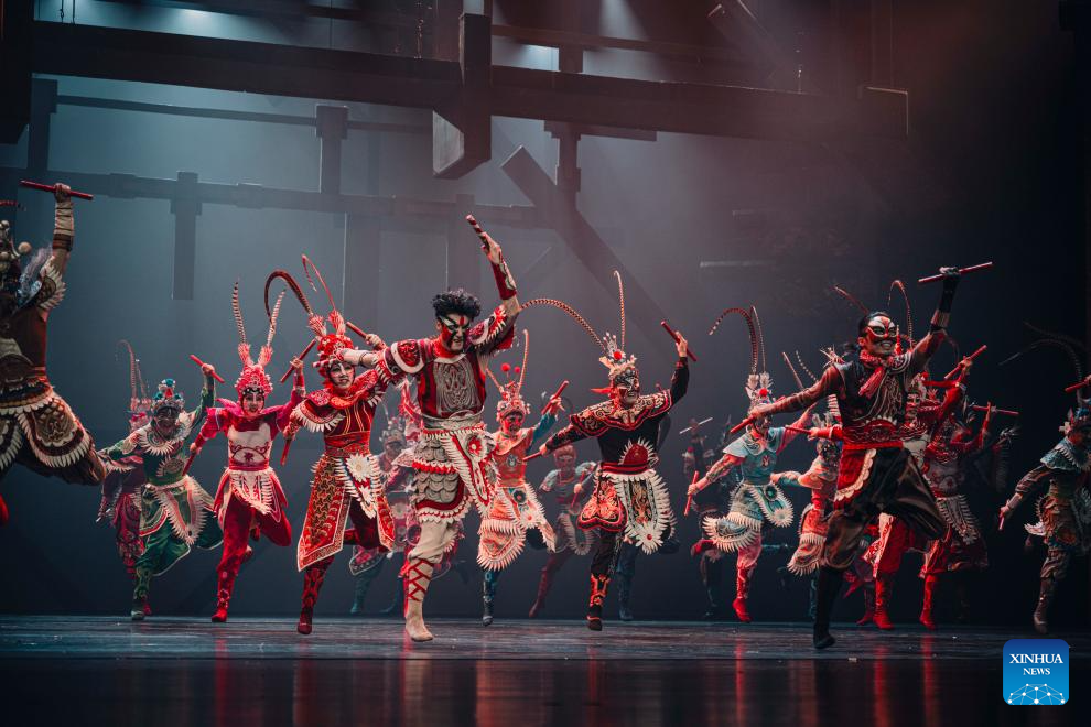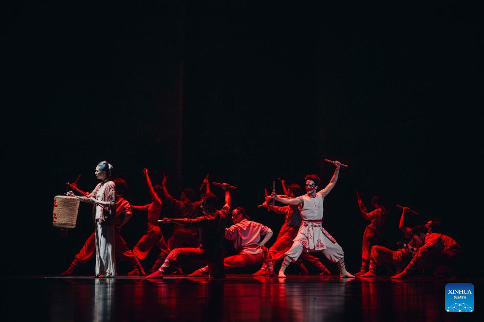 Dance drama "Odes to Heroes," performed by Guangzhou Song and Dance Theatre, is staged at the Beijing Tianqiao Performing Arts Center in Beijing, capital of China, July 31, 2025. The dance drama combines traditional Yingge, or "dance to the hero's song," intangible cultural heritage elements with modern stage art techniques. (Xinhua)