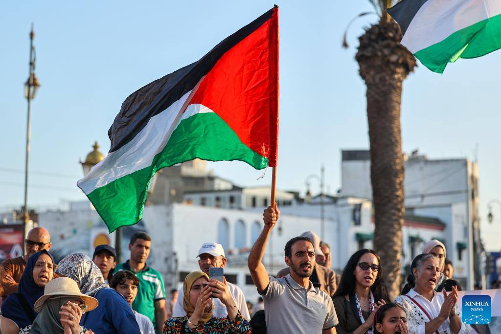 People holding Palestine flags attend a rally in support of Palestinians in Rabat, Morocco, July 31, 2025. (Xinhua/Huo Jing)