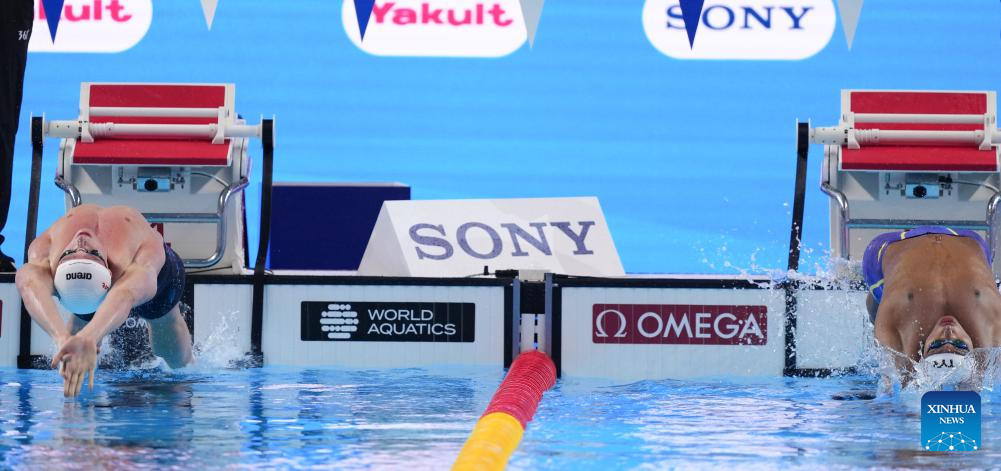 Pieter Coetze (L) of South Africa and Yohann Ndoye-Brouard of France competes during the men's 200m backstroke final at the World Aquatics Championships in Singapore, Aug. 1, 2025. (Xinhua/Wu Zhizun)