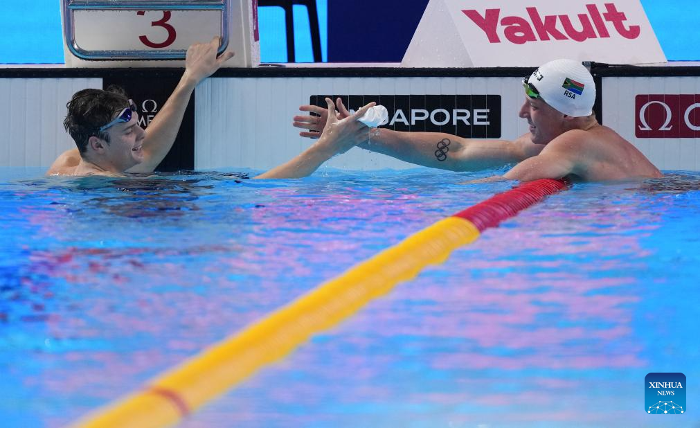 Hubert Kos (L) of Hungary is congratulated by Pieter Coetze of South Africa during the men's 200m backstroke final at the World Aquatics Championships in Singapore, Aug. 1, 2025. (Xinhua/Wu Zhizun)