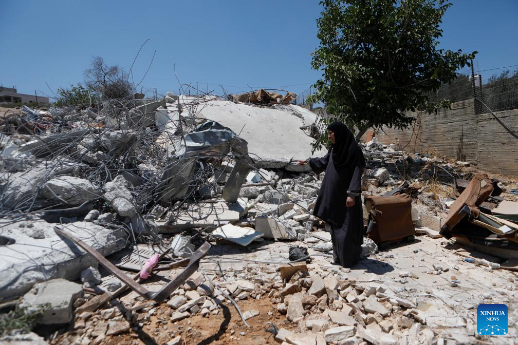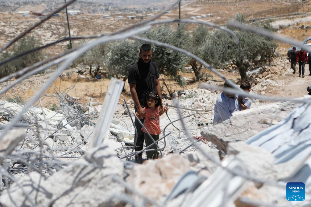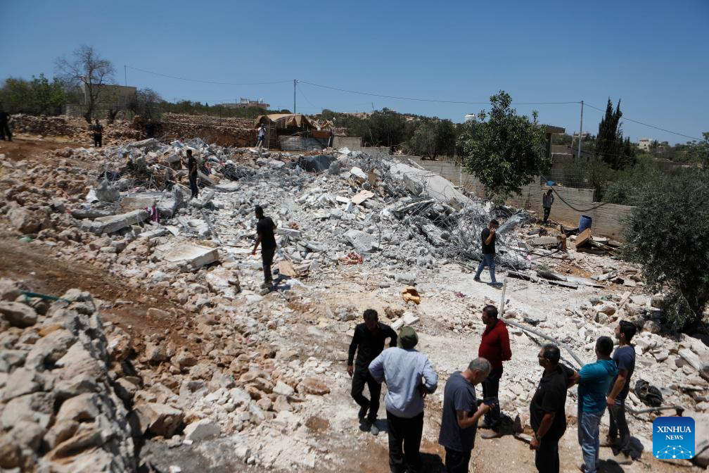 Palestinians inspect the rubble of a house after Israeli forces demolished it, in the village of Wadi Rahhal, south of Bethlehem in the southern West Bank, on July 31, 2025. (Photo by Mamoun Wazwaz/Xinhua)