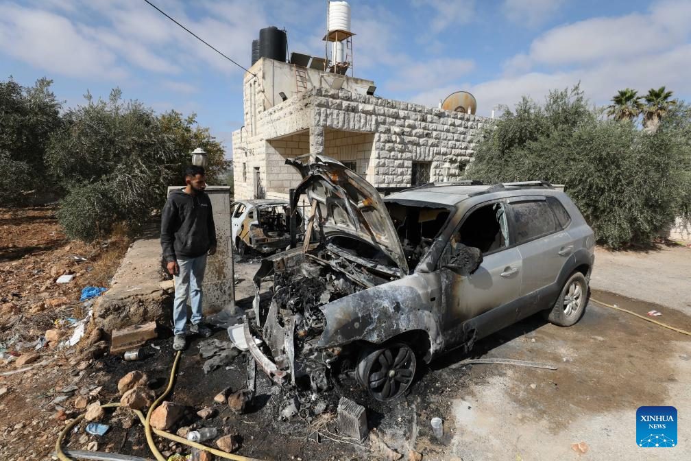 A Palestinian inspects a burnt car following an Israeli settler attack in the village of Silwad, in the West Bank city of Ramallah, on July 31, 2025. (Photo by Nidal Eshtayeh/Xinhua)