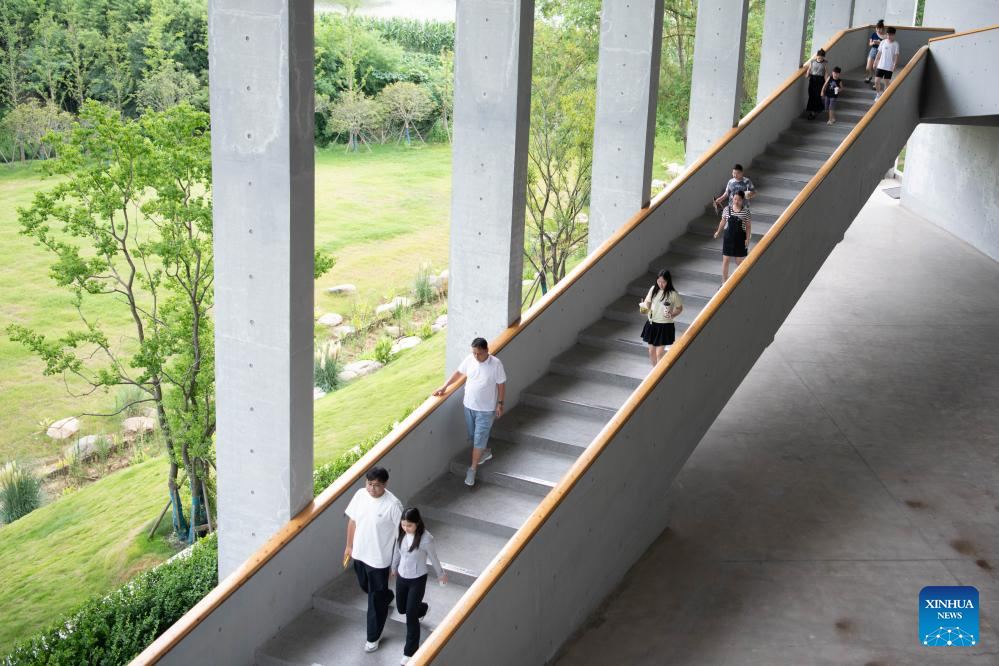 Tourists walk downstairs at a movie theater in Changchong Village, Lujiang County, east China's Anhui Province, July 26, 2025. Changchong Village has endeavored to develop its tourism industry by integrating its natural scenery and cultural experiences. The movie theater and tea house built in the nature environment provide unique experiences for visitors. Changchong has became a popular attraction for urban residents to enjoy life in the countryside. (Xinhua/Zhang Duan)
