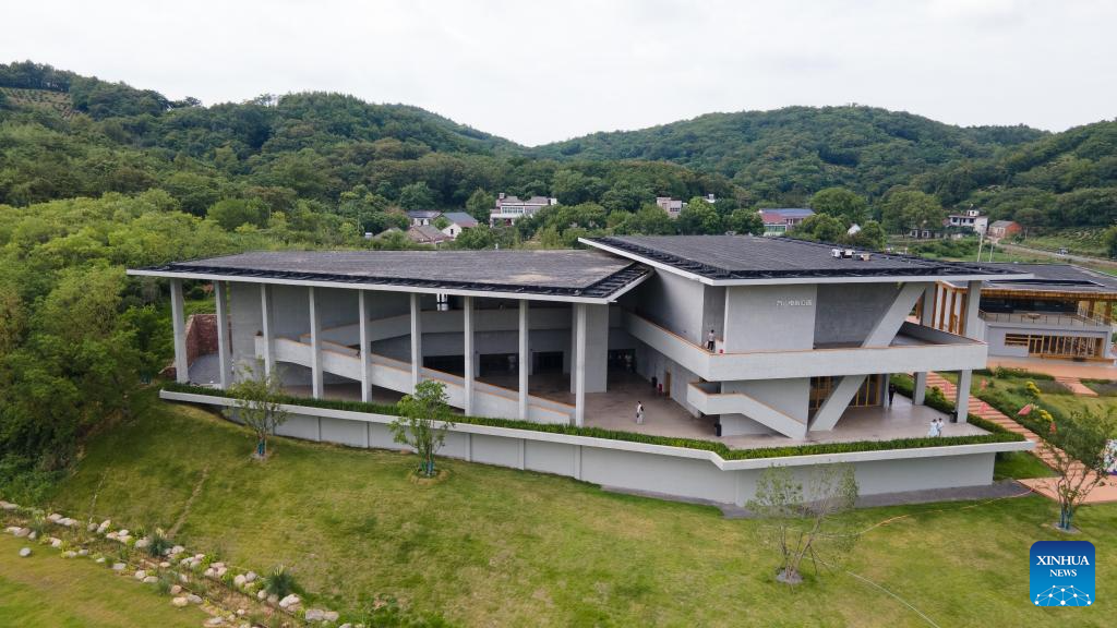 This aerial drone photo taken on July 26, 2025 shows a general view of a movie theater in Changchong Village, Lujiang County, east China's Anhui Province. Changchong Village has endeavored to develop its tourism industry by integrating its natural scenery and cultural experiences. The movie theater and tea house built in the nature environment provide unique experiences for visitors. Changchong has became a popular attraction for urban residents to enjoy life in the countryside. (Xinhua/Zhang Duan)