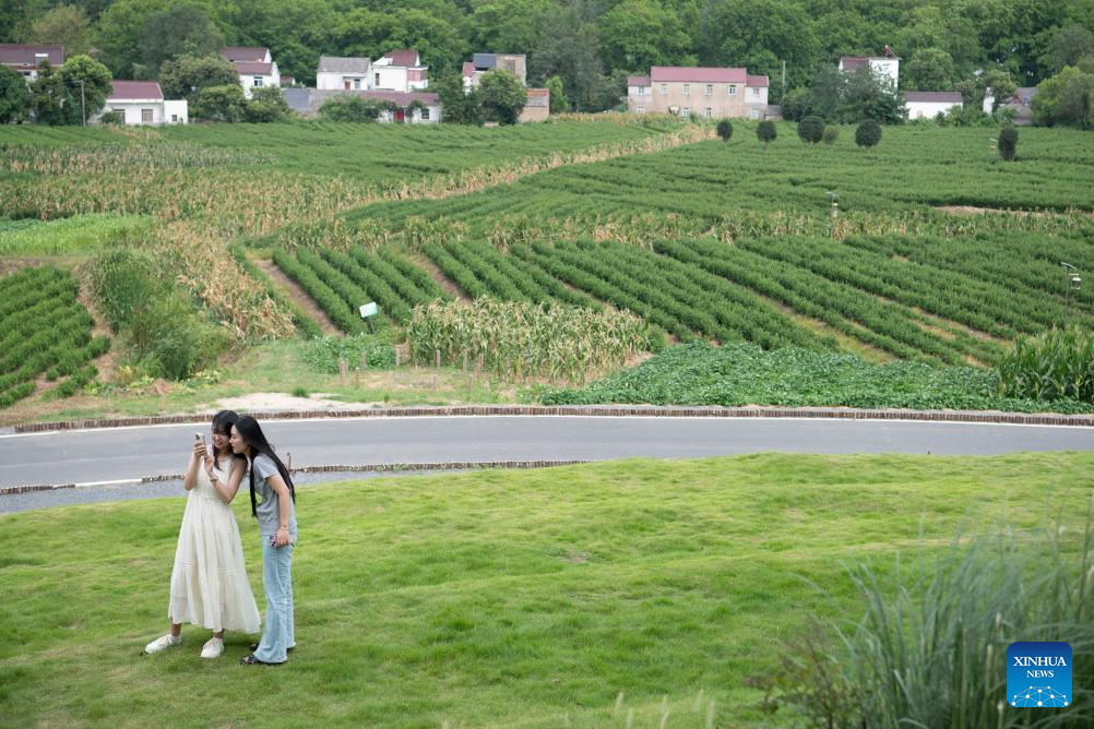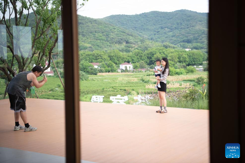 Tourists pose for photos outside a tea house in Changchong Village, Lujiang County, east China's Anhui Province, July 26, 2025. Changchong Village has endeavored to develop its tourism industry by integrating its natural scenery and cultural experiences. The movie theater and tea house built in the nature environment provide unique experiences for visitors. Changchong has became a popular attraction for urban residents to enjoy life in the countryside. (Xinhua/Zhang Duan)