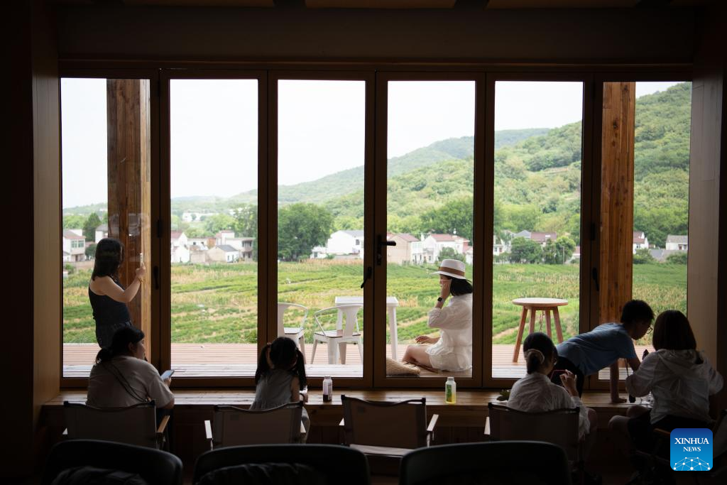 Tourists rest at a tea house in Changchong Village, Lujiang County, east China's Anhui Province, July 26, 2025. Changchong Village has endeavored to develop its tourism industry by integrating its natural scenery and cultural experiences. The movie theater and tea house built in the nature environment provide unique experiences for visitors. Changchong has became a popular attraction for urban residents to enjoy life in the countryside. (Xinhua/Zhang Duan)