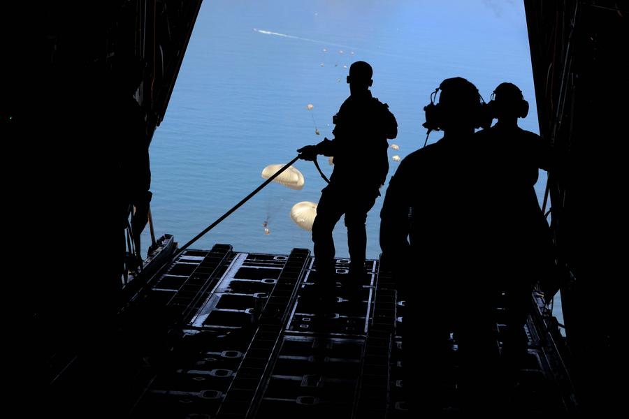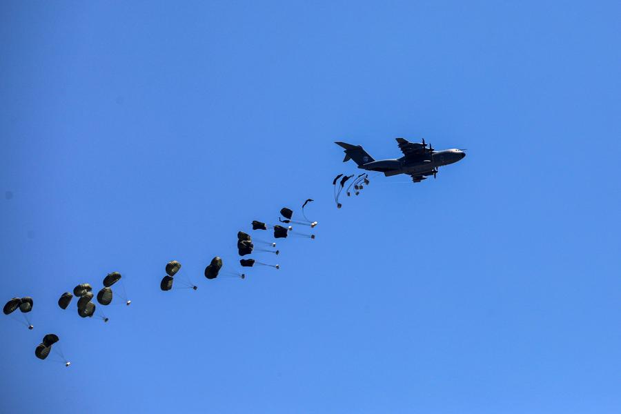 A plane drops humanitarian aid over the Gaza Strip, on Aug. 1, 2025. (Photo by Rizek Abdeljawad/Xinhua)