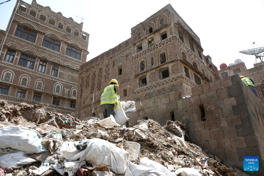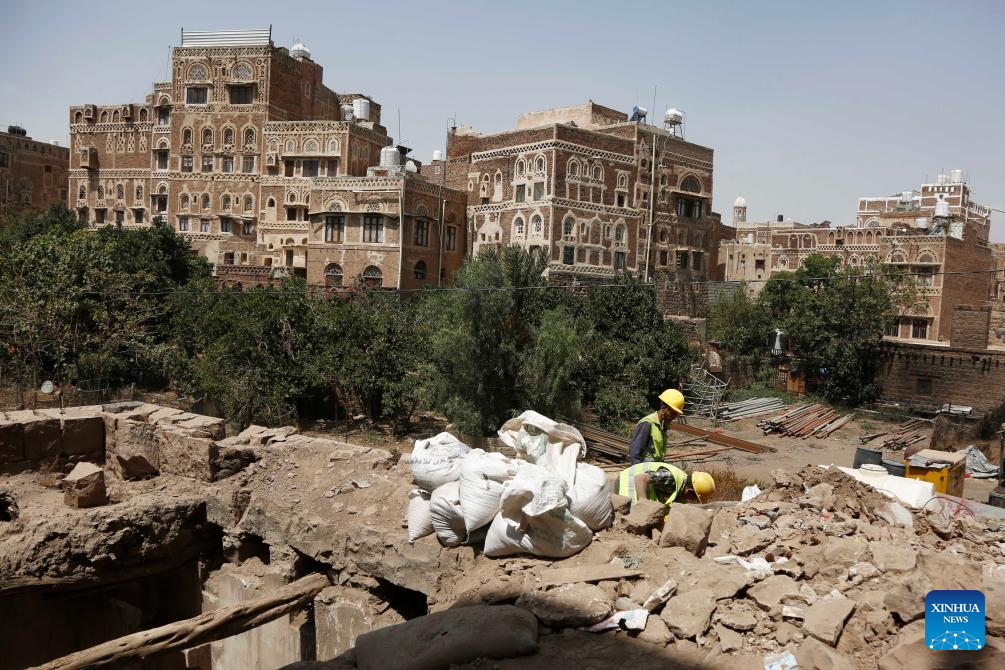 Workers remove debris during the restoration of old buildings in the Old City of Sanaa, Yemen, July 30, 2025. Yemen's UNESCO-listed Old City of Sanaa, home to over 6,000 unique multi-story mud-brick structures dating back 2,500 years, is undergoing urgent restoration after monsoon damage to its historic fabric, according to local residents and authorities. (Photo by Mohammed/Xinhua)