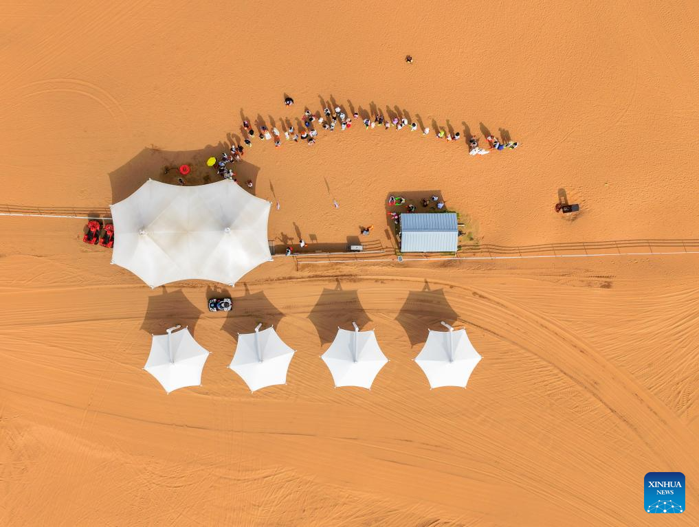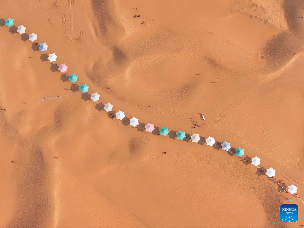 Tourists visit a desert scenic area in Dalad Banner of Erdos City, north China's Inner Mongolia Autonomous Region, Aug. 1, 2025. Kubuqi desert in Erdos City has entered its peak tourist season in midsummer, attracting numerous tourists from around the country to visit. (Xinhua/Lian Zhen)