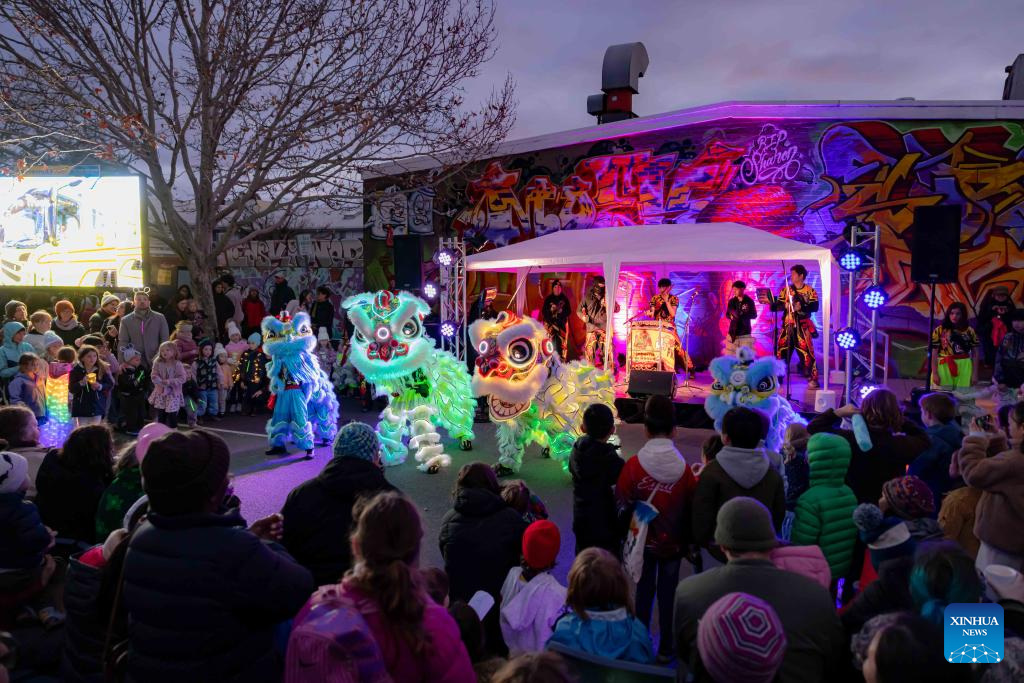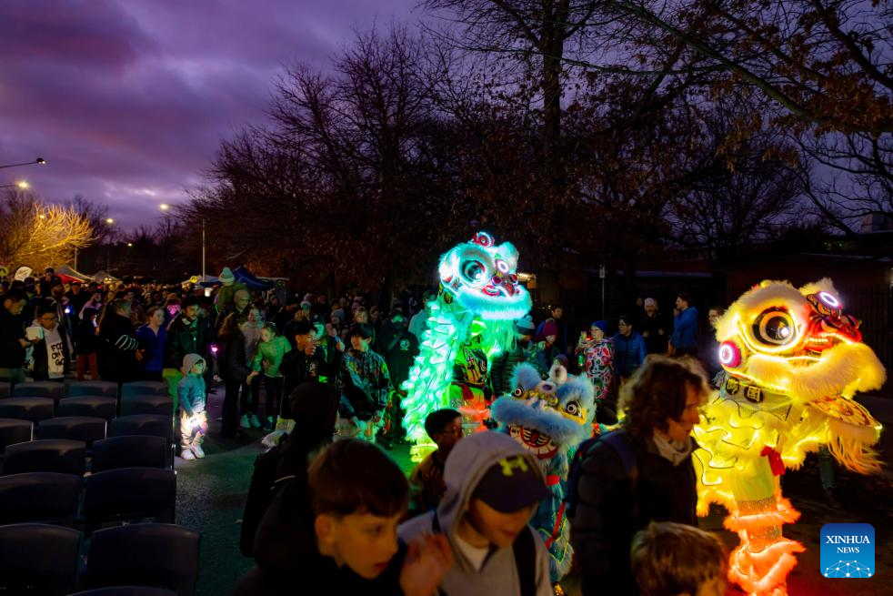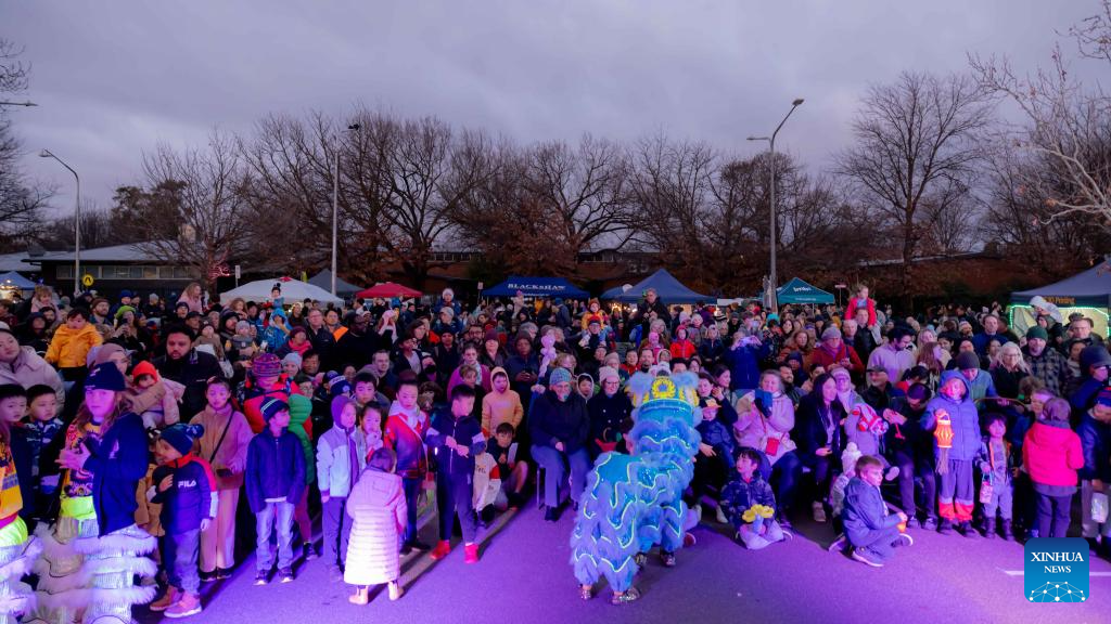 This photo taken on Aug. 2, 2025 shows the scene in the "Light Up Lyneham" winter community celebration in Canberra, Australia. The "Light Up Lyneham" 2025 winter community celebration took place on Saturday in Canberra, featuring food, music, lion dance performance, artistic lighting and lantern display. (Photo by Chu Chen/Xinhua)