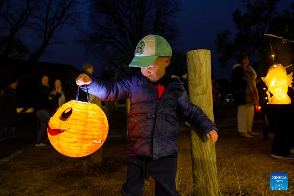 A little boy holds a lantern in the "Light Up Lyneham" winter community celebration in Canberra, Australia, Aug. 2, 2025. The "Light Up Lyneham" 2025 winter community celebration took place on Saturday in Canberra, featuring food, music, lion dance performance, artistic lighting and lantern display. (Photo by Chu Chen/Xinhua)