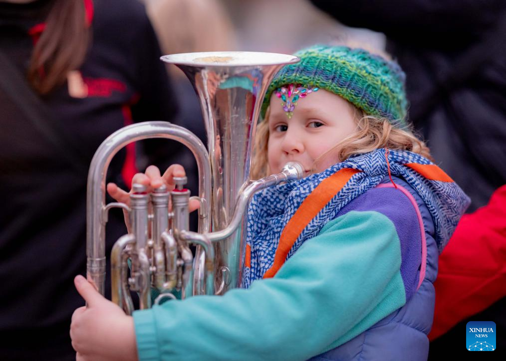 A little girl performs a brass instrument in the "Light Up Lyneham" winter community celebration in Canberra, Australia, Aug. 2, 2025. The "Light Up Lyneham" 2025 winter community celebration took place on Saturday in Canberra, featuring food, music, lion dance performance, artistic lighting and lantern display. (Photo by Chu Chen/Xinhua)