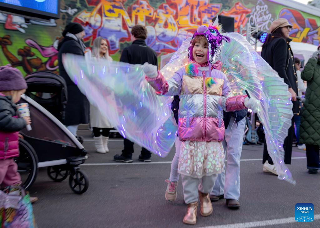A little girl wearing an artistic light costume is pictured in the "Light Up Lyneham" winter community celebration in Canberra, Australia, Aug. 2, 2025. The "Light Up Lyneham" 2025 winter community celebration took place on Saturday in Canberra, featuring food, music, lion dance performance, artistic lighting and lantern display. (Photo by Chu Chen/Xinhua)