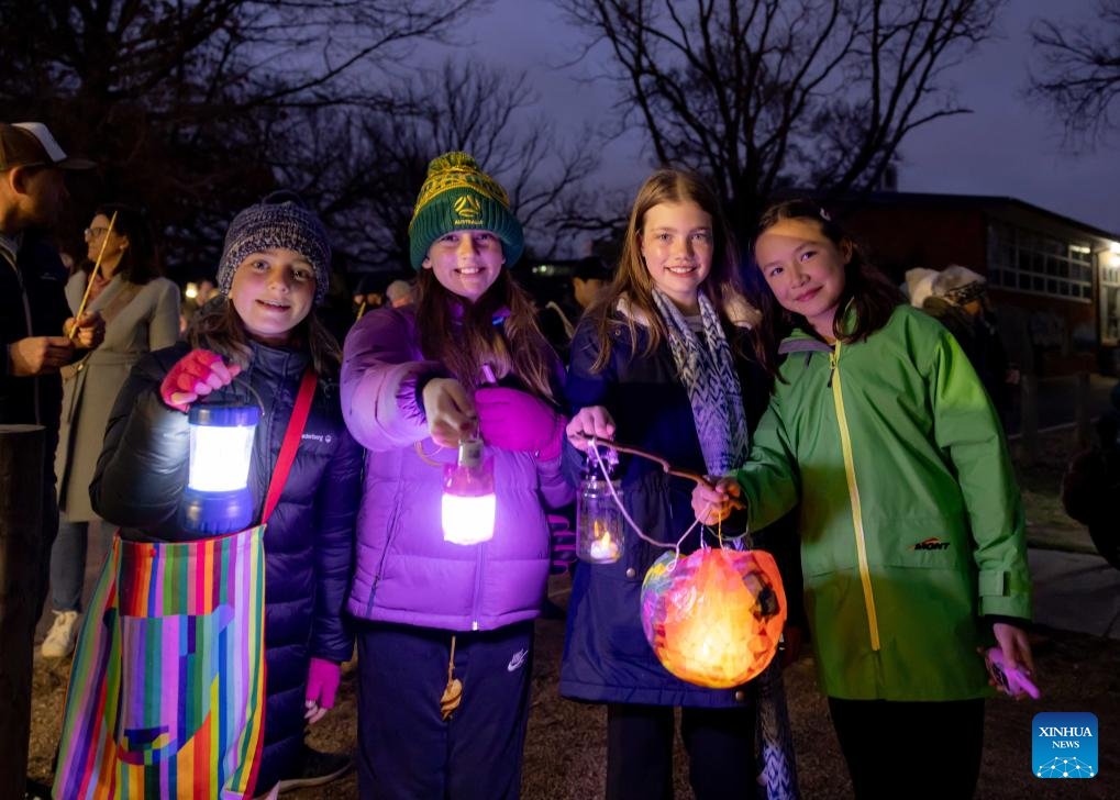 People hold lanterns to participate in the "Light Up Lyneham" winter community celebration in Canberra, Australia, Aug. 2, 2025. The "Light Up Lyneham" 2025 winter community celebration took place on Saturday in Canberra, featuring food, music, lion dance performance, artistic lighting and lantern display. (Photo by Chu Chen/Xinhua)