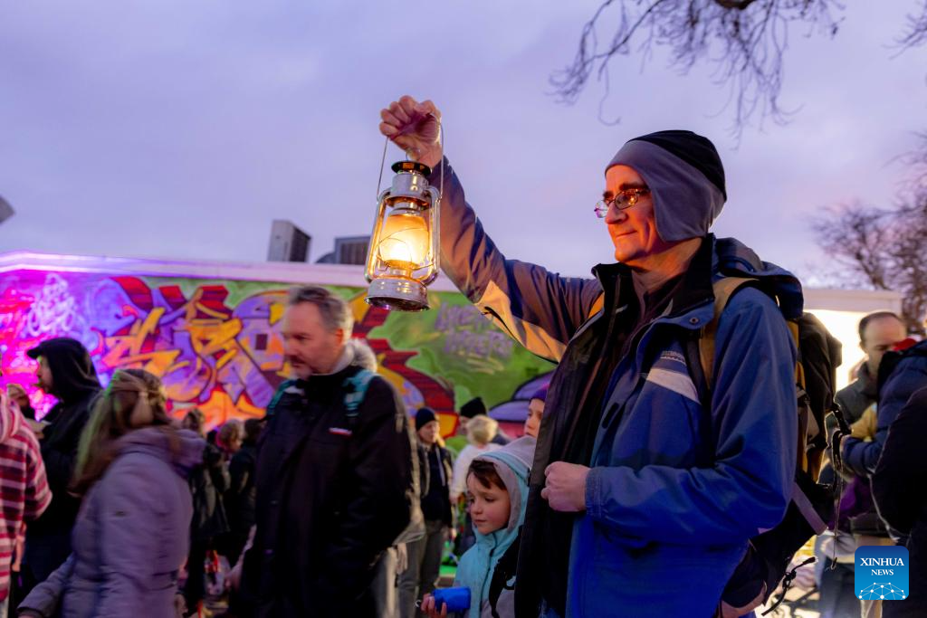 A man holds a kerosene lamp in the "Light Up Lyneham" winter community celebration in Canberra, Australia, Aug. 2, 2025. The "Light Up Lyneham" 2025 winter community celebration took place on Saturday in Canberra, featuring food, music, lion dance performance, artistic lighting and lantern display. (Photo by Chu Chen/Xinhua)
