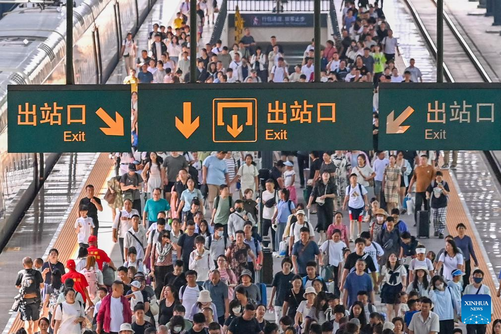 Passengers exit the Harbin Railway Station in Harbin, northeast China's Heilongjiang Province, Aug. 2, 2025. This year's summer travel rush will last for 62 days from July 1 to Aug. 31. From July 1 to 31, China Railway Harbin Bureau Group had handled 9.775 million passenger trips, and the daily average number of passenger trips reached 315,000. (Photo by Yuan Yong/Xinhua)