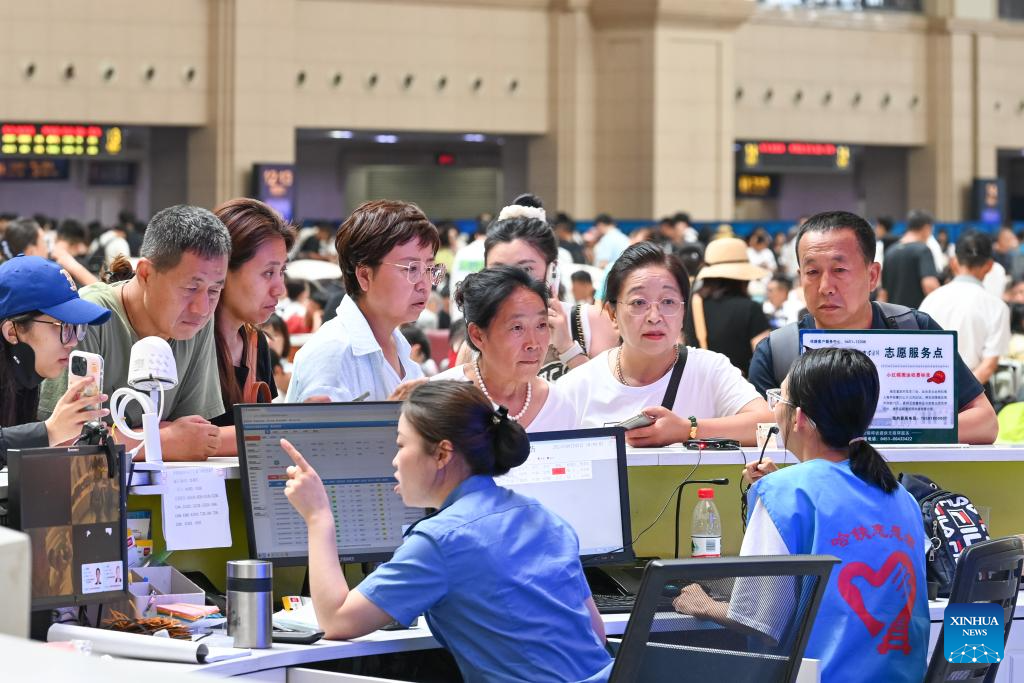 Staff answer passengers' inquiries at Harbin Railway Station in Harbin, northeast China's Heilongjiang Province, Aug. 2, 2025. This year's summer travel rush will last for 62 days from July 1 to Aug. 31. From July 1 to 31, China Railway Harbin Bureau Group had handled 9.775 million passenger trips, and the daily average number of passenger trips reached 315,000. (Photo by Yuan Yong/Xinhua)