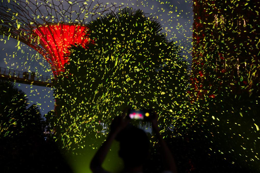 A tourist takes a photo of the firefly-like SPARK light installation, as part of celebration activities for Singapore's 60th anniversary of independence held in Singapore's Gardens by the Bay, on Aug. 1, 2025. (Then Chih Wey/Xinhua)