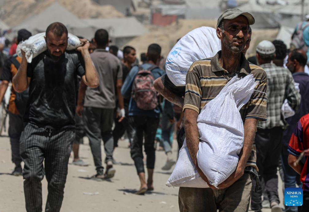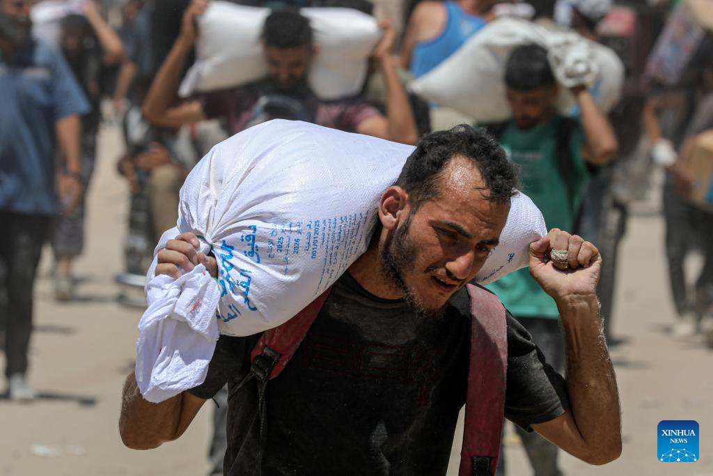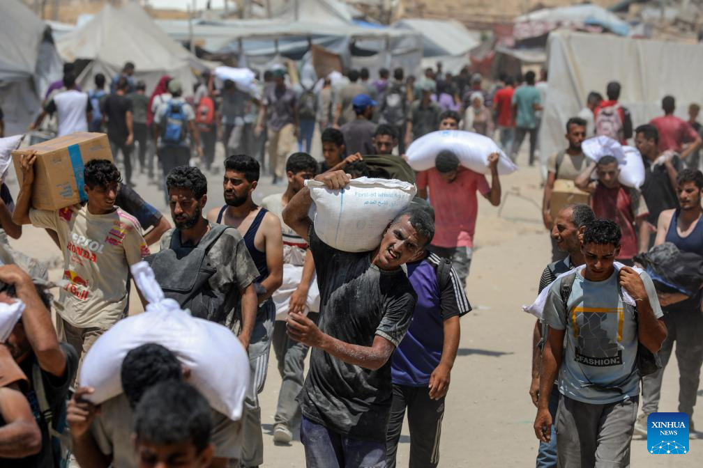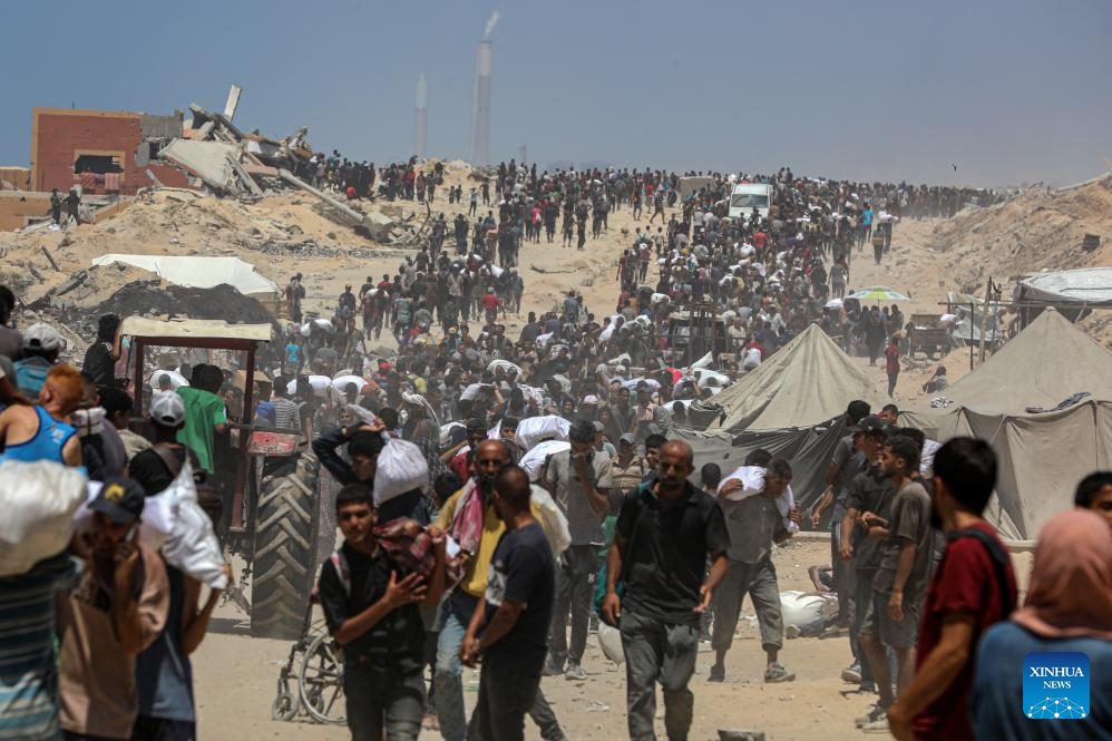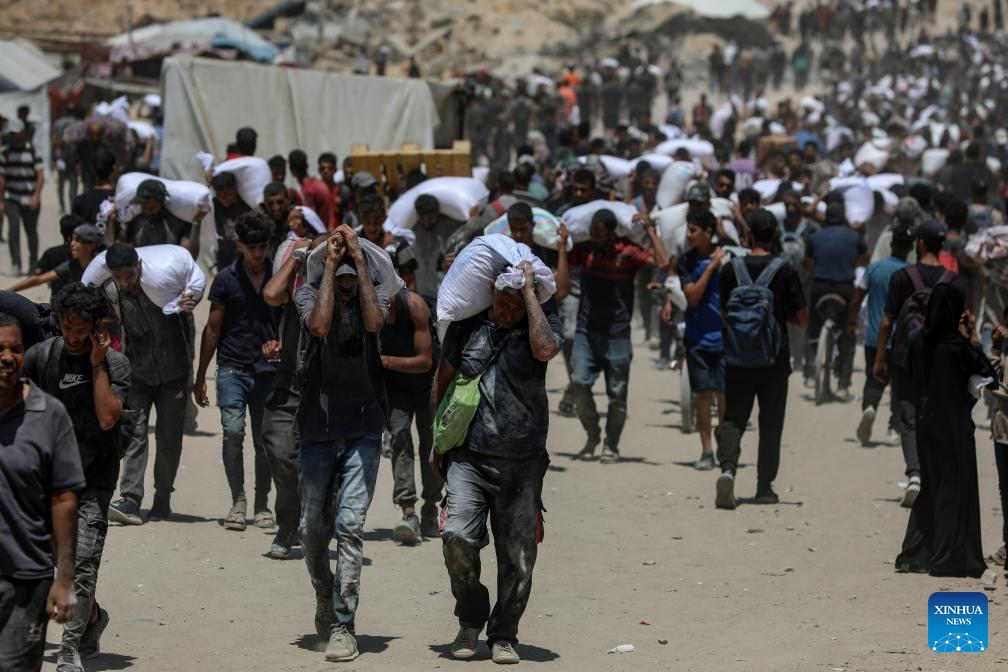 Palestinians carry humanitarian aid in Beit Lahia, northern Gaza Strip, on Aug. 1, 2025. (Photo by Rizek Abdeljawad/Xinhua)