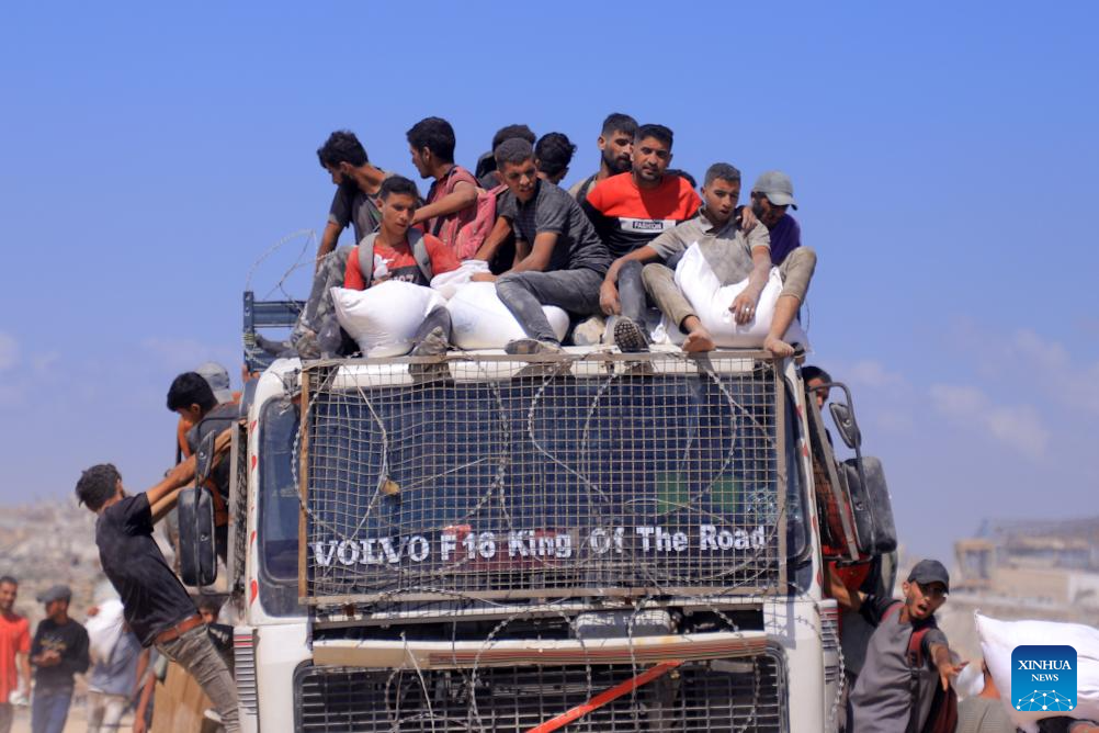 Palestinians transfer humanitarian aid in Beit Lahia, northern Gaza Strip, on Aug. 1, 2025. (Photo by Rizek Abdeljawad/Xinhua)