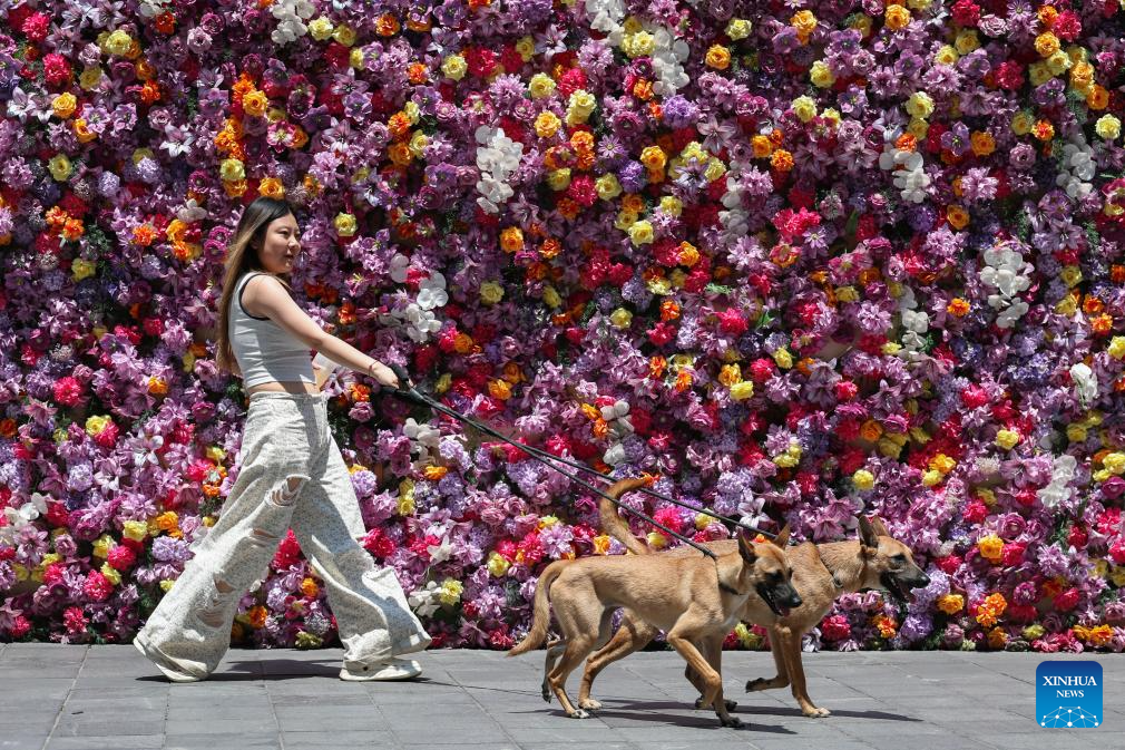 A woman walks her dogs under the sunshine in Jiangbei District, southwest China's Chongqing Municipality, Aug. 2, 2025. Chongqing issued a heatwave alert on Saturday, with high temperature hitting 40-43 degrees Celsius. (Xinhua/Chen Cheng)