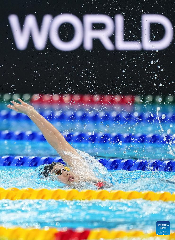 Yu Zidi of China competes during the women's 400m individual medley final of swimming at the World Aquatics Championships in Singapore, Aug. 3, 2025. (Xinhua/Xia Yifang)