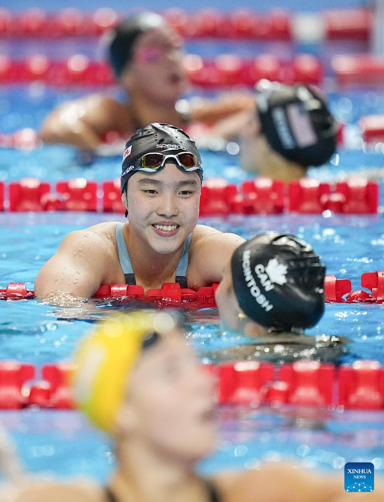 Yu Zidi (C) of China is seen after the women's 400m individual medley final of swimming at the World Aquatics Championships in Singapore, Aug. 3, 2025. (Xinhua/Xia Yifang)