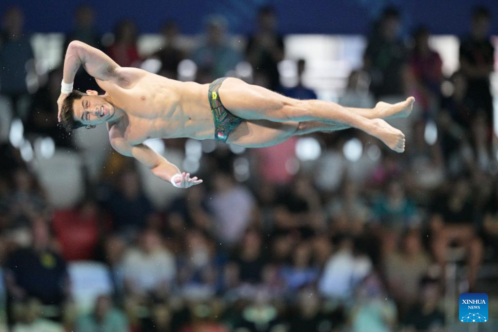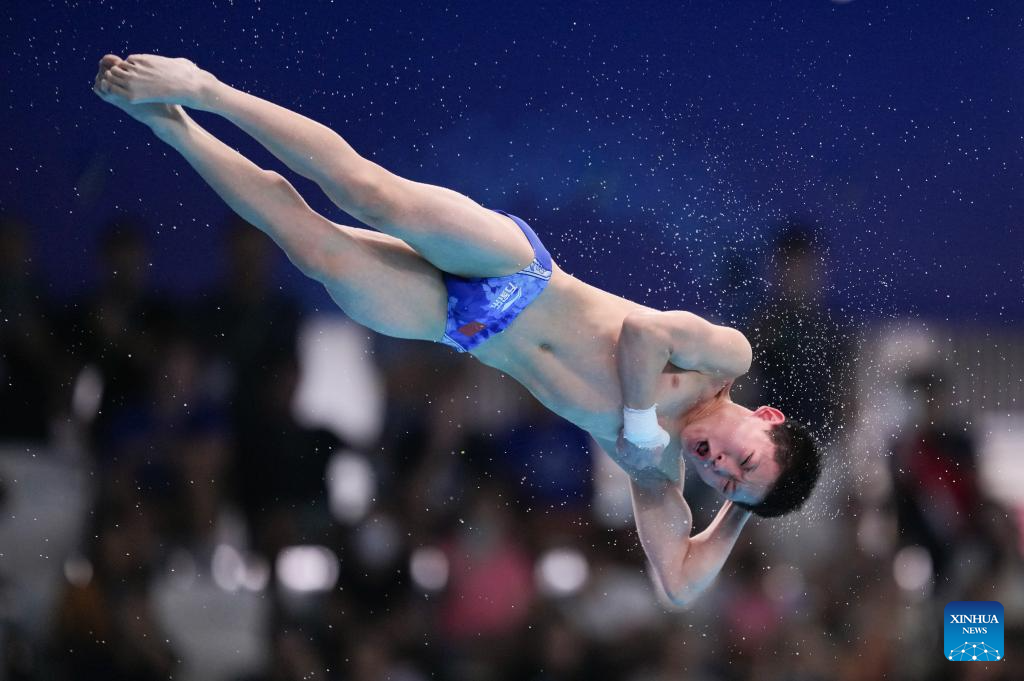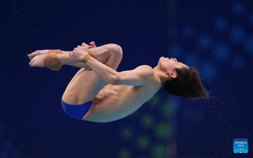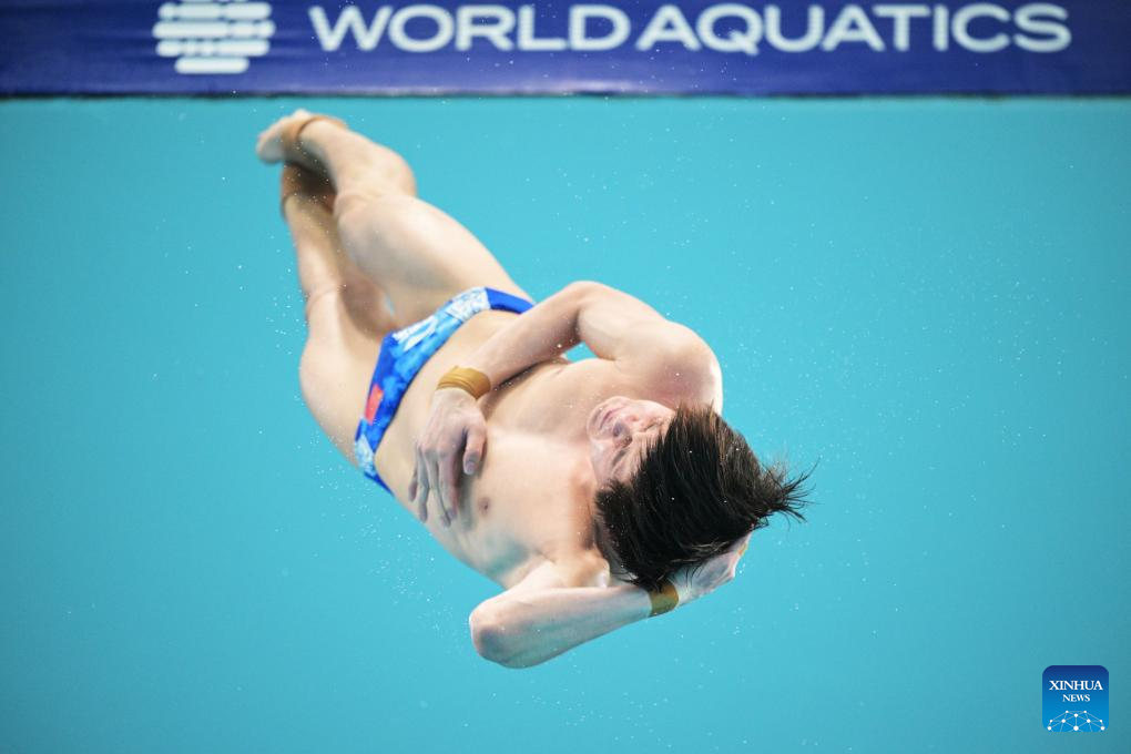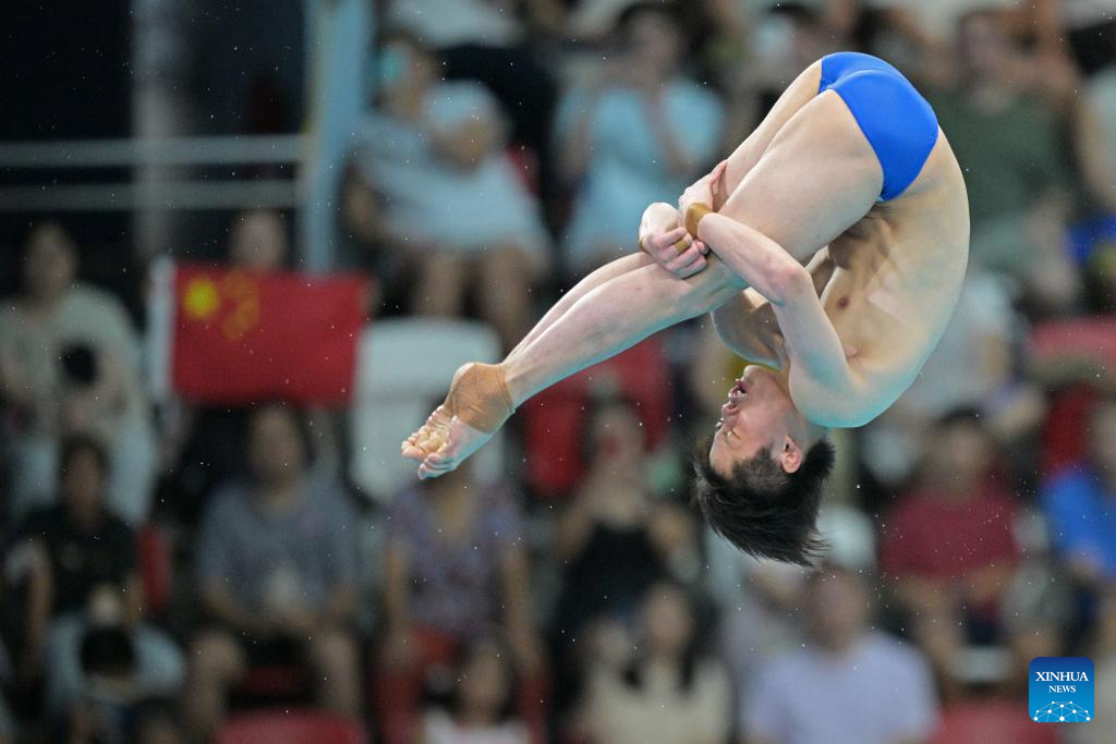 Zhu Zifeng of China competes during the men's 10m platform final of diving at the World Aquatics Championships in Singapore, Aug. 3, 2025. (Xinhua/Wu Zhizun)