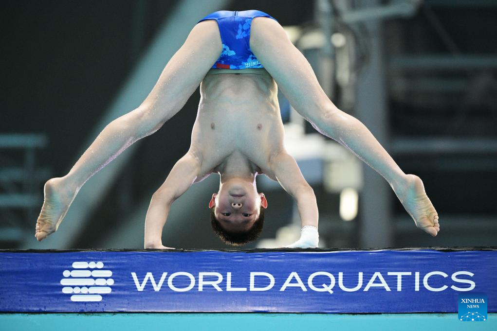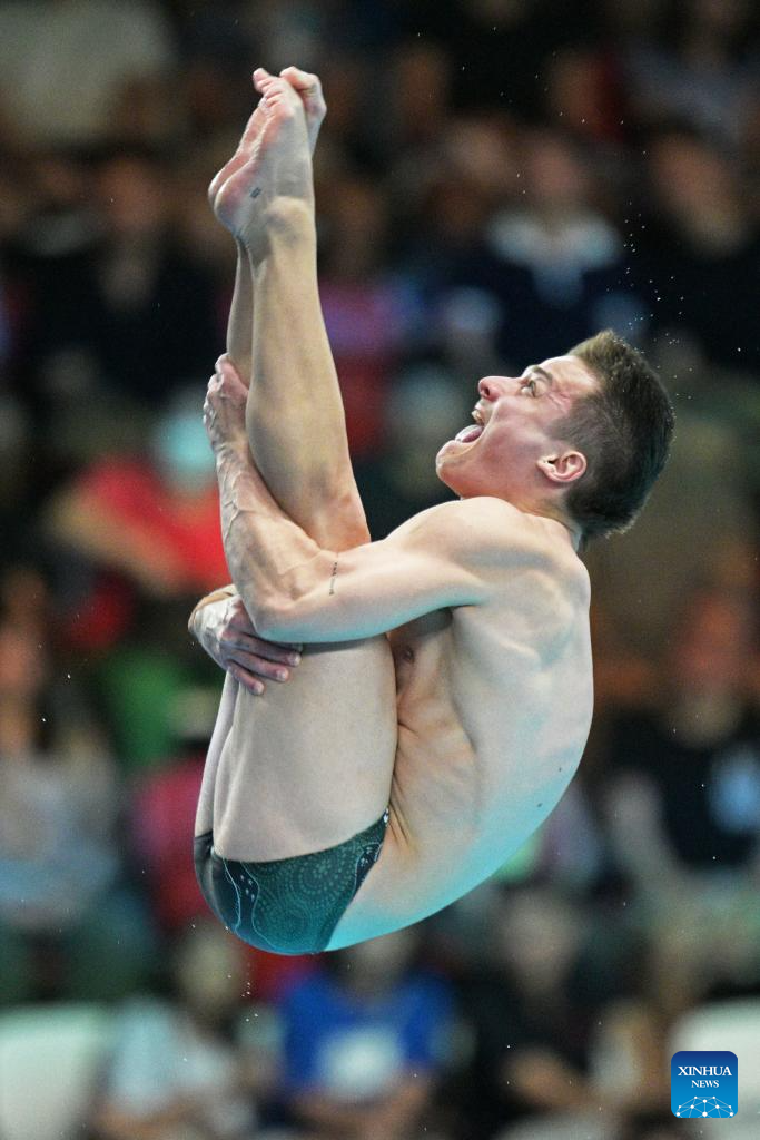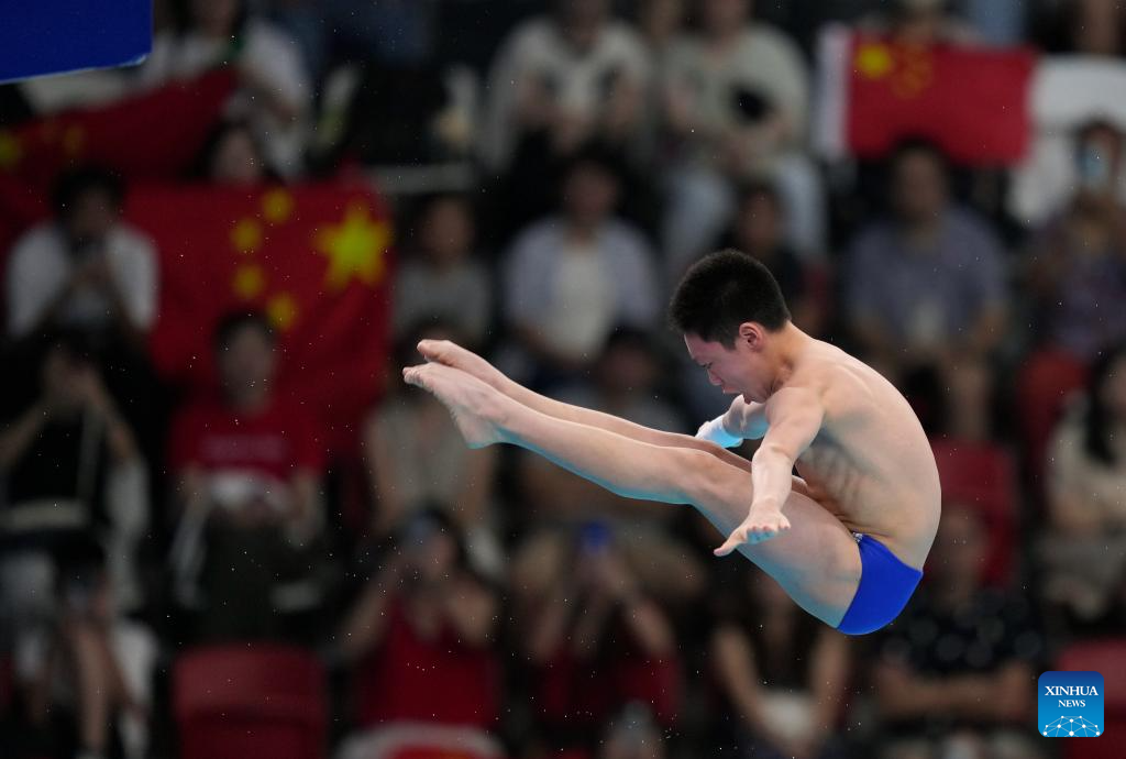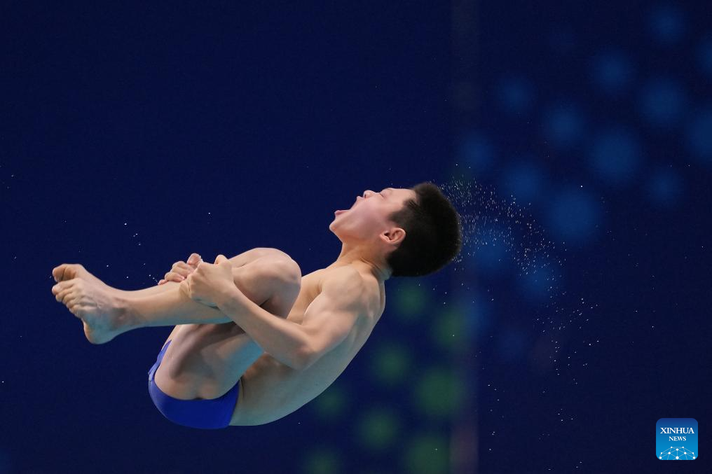 Zhu Zifeng of China competes during the men's 10m platform final of diving at the World Aquatics Championships in Singapore, Aug. 3, 2025. (Xinhua/Wu Zhizun)