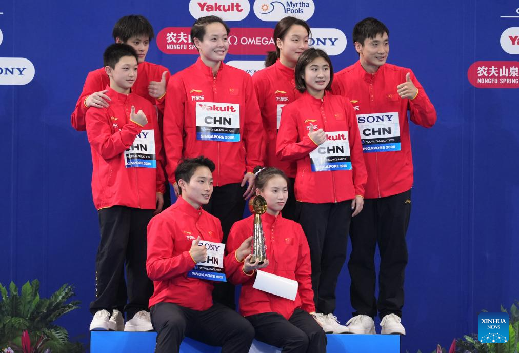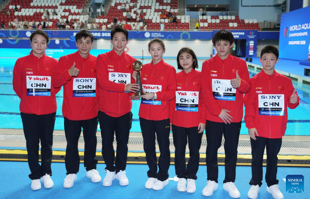 Team China pose with a team trophy after the men's 10m platform final of diving at the World Aquatics Championships in Singapore, Aug. 3, 2025. (Xinhua/Wu Zhizun)