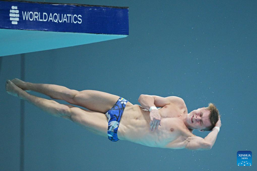 Oleksii Sereda of Ukraine competes during the men's 10m platform final of diving at the World Aquatics Championships in Singapore, Aug. 3, 2025. (Photo by Then Chih Wey/Xinhua)